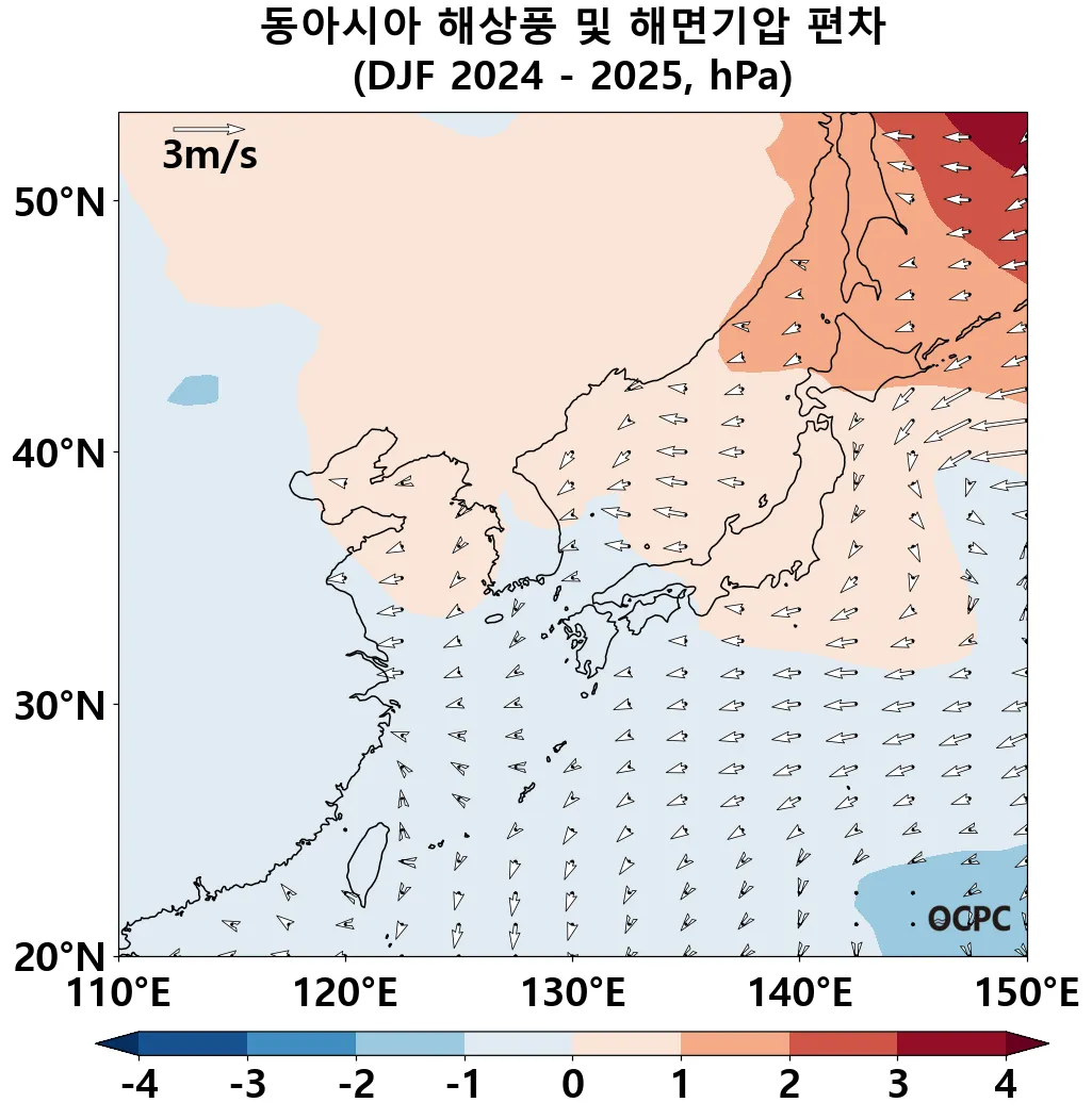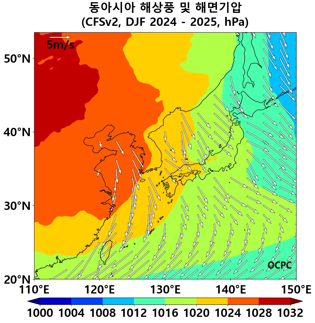 A. 동아시아 해상풍 및 해면기압 전망(2024년 12월~2025년 2월 평균)
