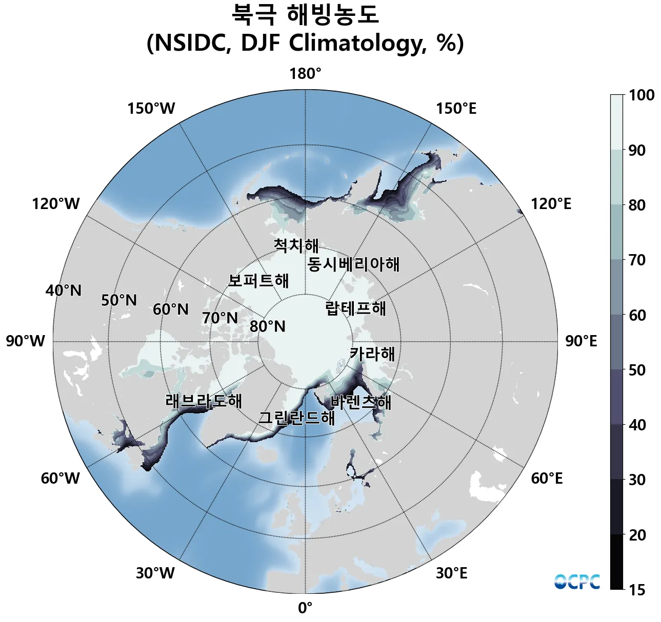 B. 북극 해빙농도(평년 12월~2월 평균, 15% 이상 해역)