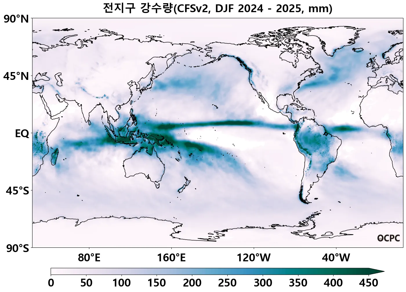 전지구 2024년 12월~2025년 2월 평균 해상강수량은 평년(96.4±1.6mm)보다 적겠습니다.