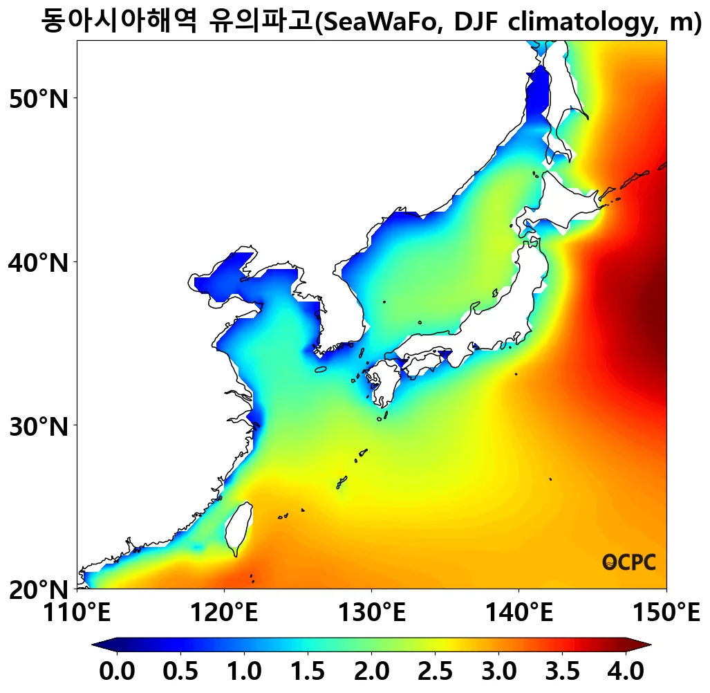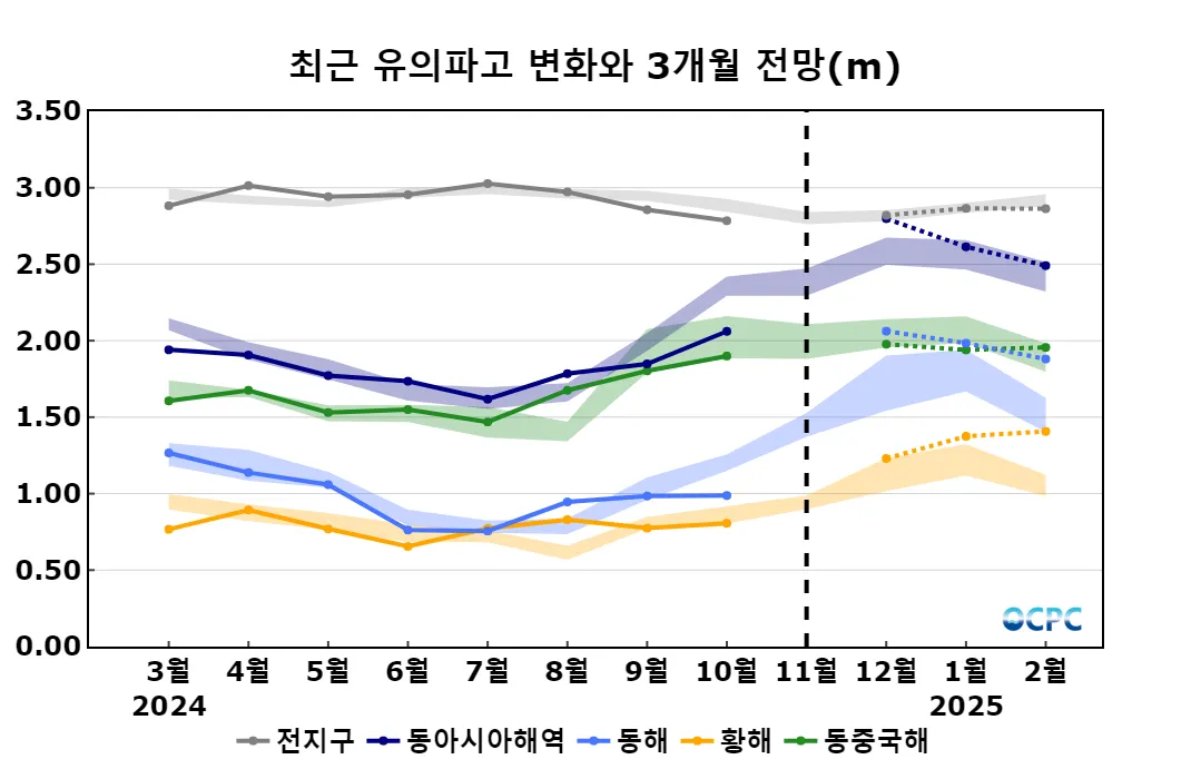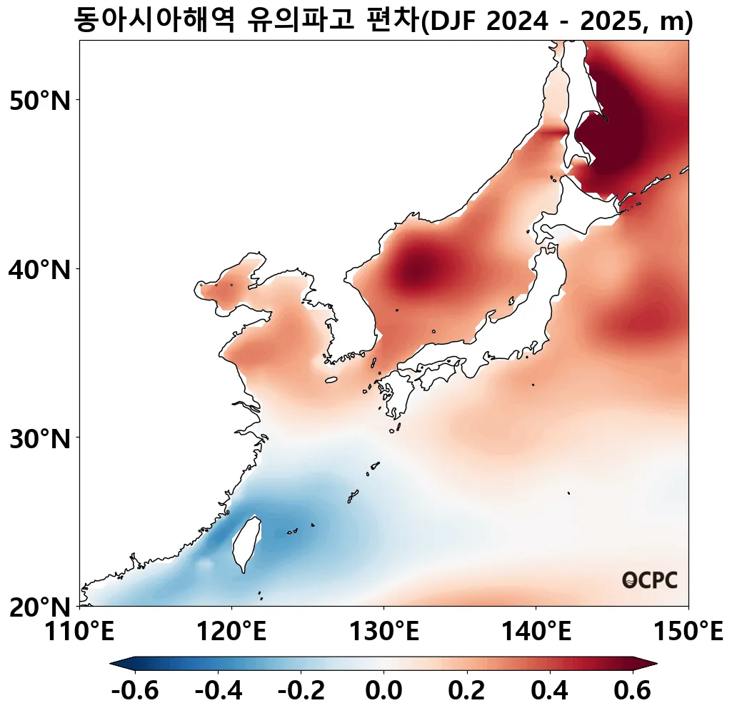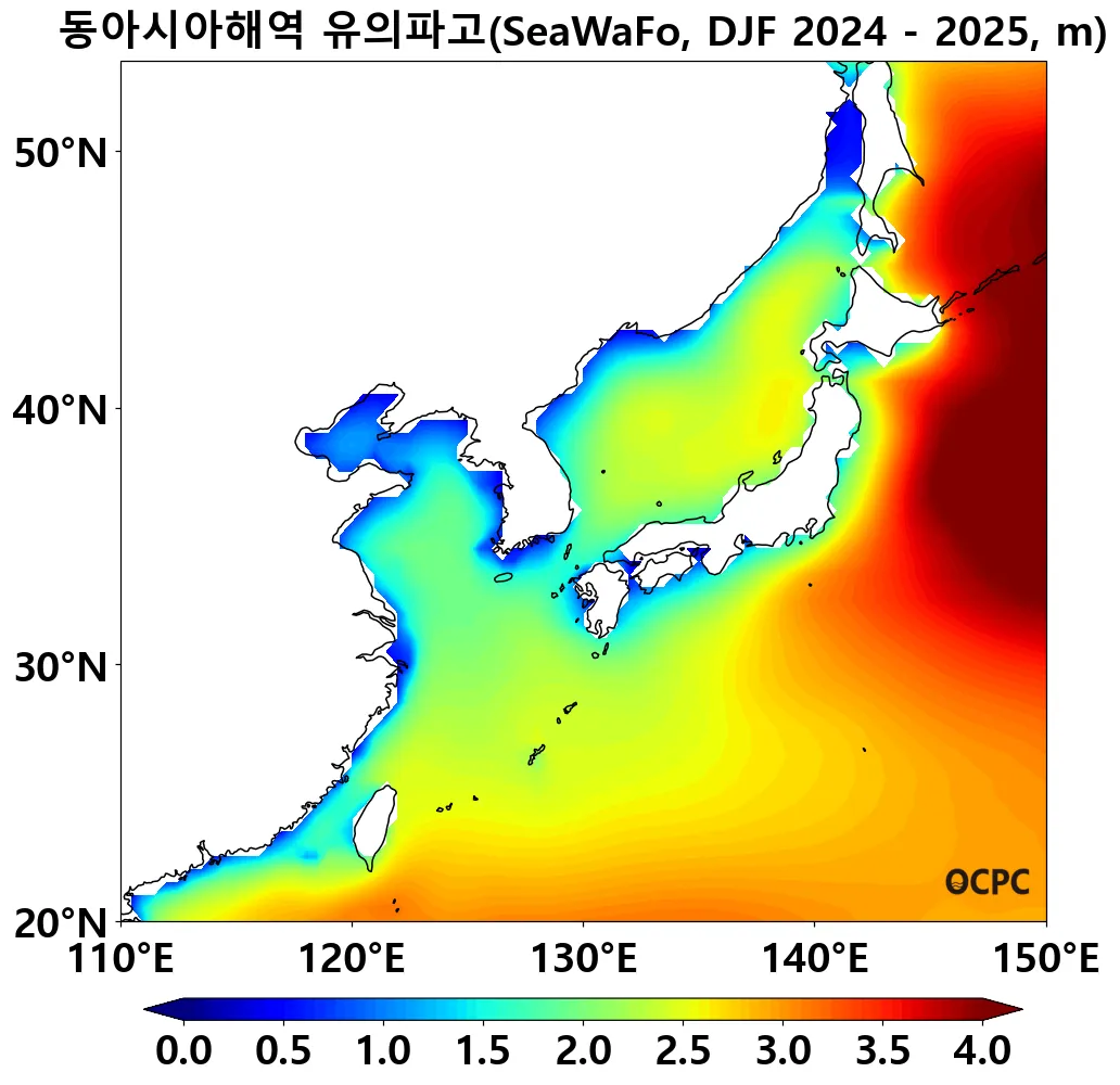 동아시아해역의 2024년 12월~2025년 2월 평균 유의파고는 평년(2.52±0.09m)보다 증가할 것으로 전망됩니다.