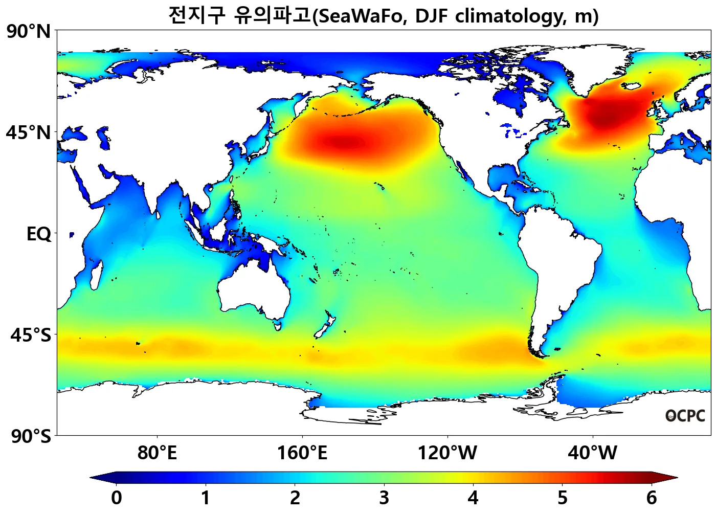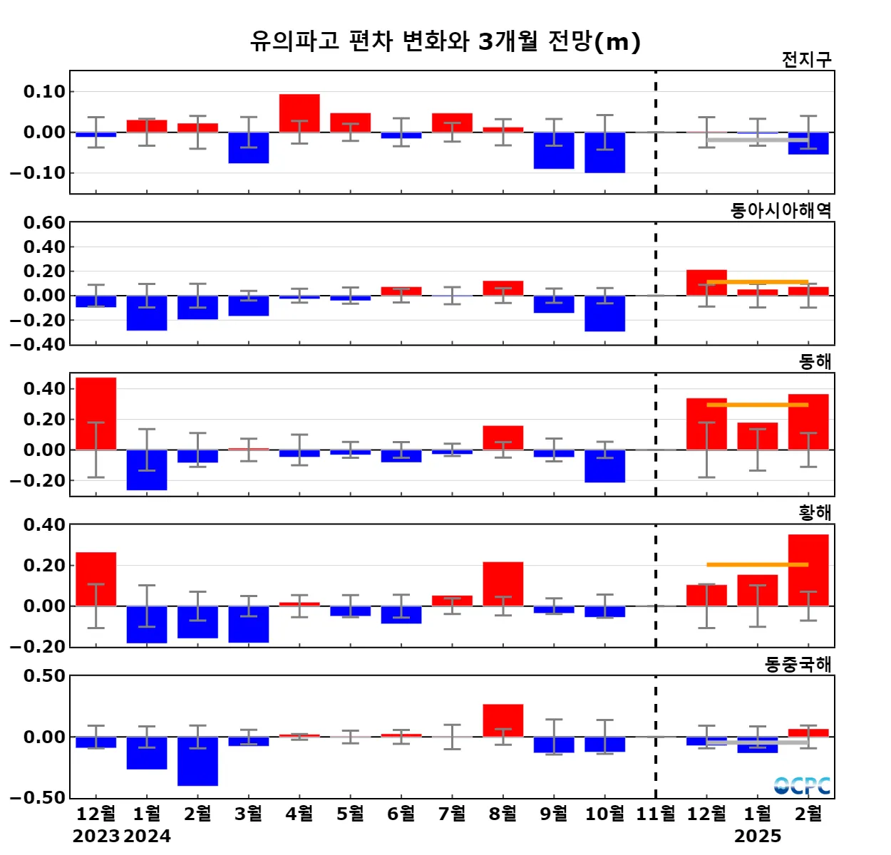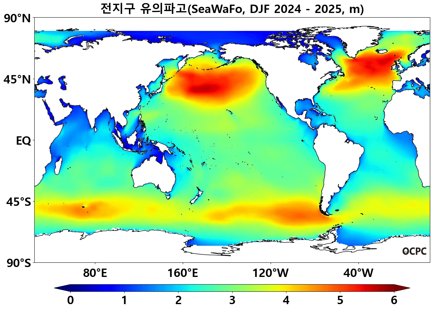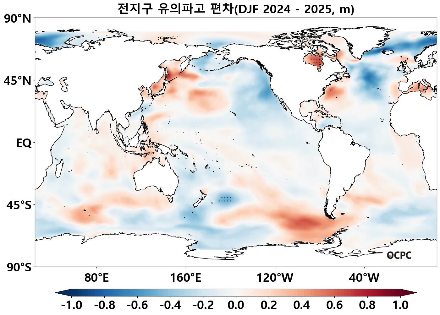 동아시아해역의 2024년 12월~2025년 2월 평균 유의파고는 평년(2.52±0.09m)보다 증가할 것으로 전망됩니다.