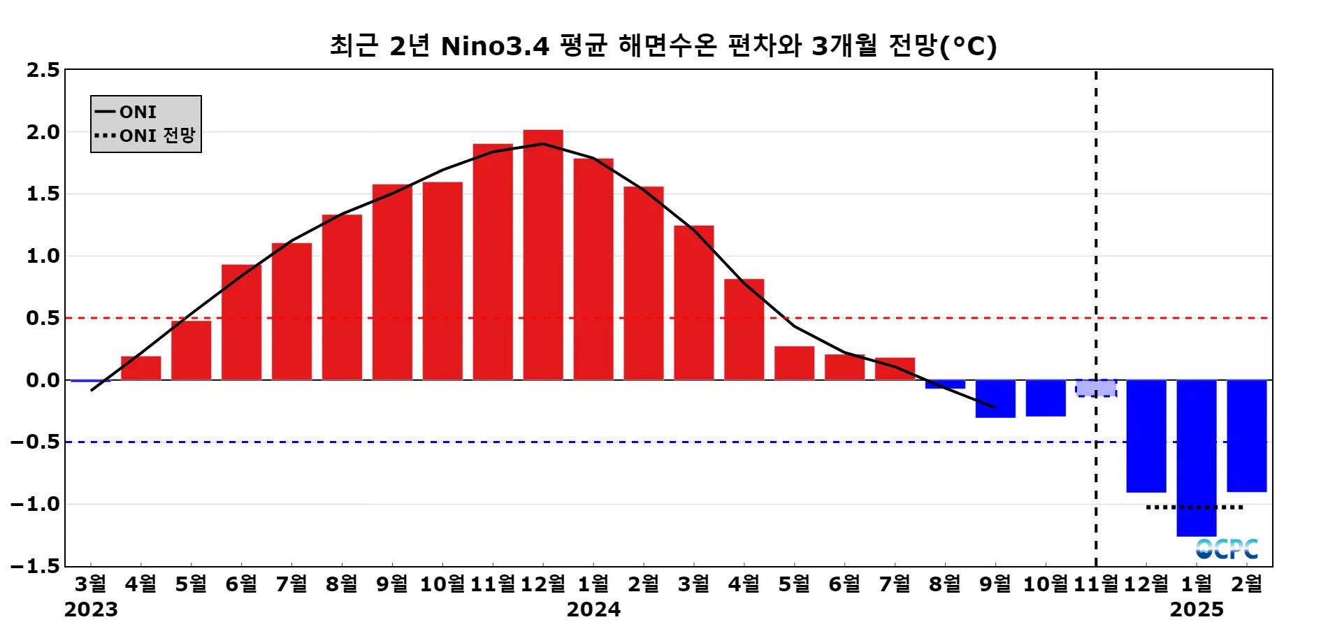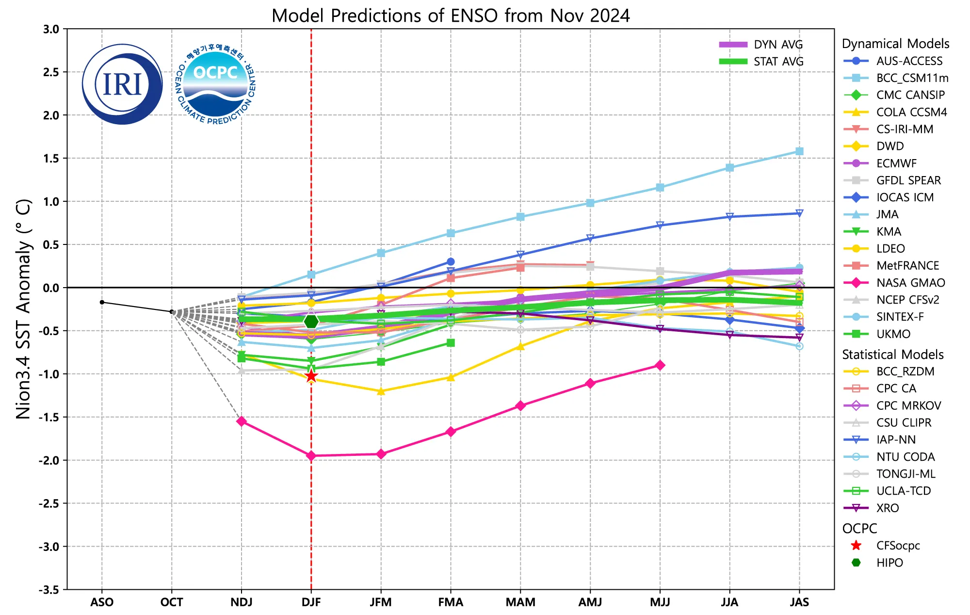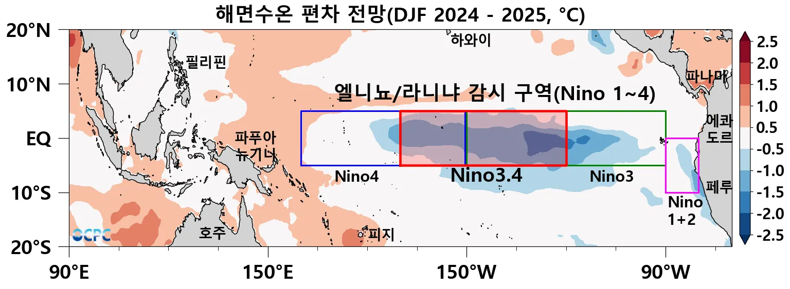 엘니뇨/라니냐 감시구역인 Nino3.4 해역(5°S~5°N, 170°W~120°W)의 11월 1~20일 평균 해면수온 편차는 -0.1℃로 중립 상태이며, 2024년 12월~2025년 2월(DJF) 평균 해면수온 편차는 -0.5℃ 이하로 라니냐 상태로 전망됩니다. IRI 역학 예측 모형 평균값도 -0.6℃로 약한 라니냐 상태를 전망하고 있습니다.
