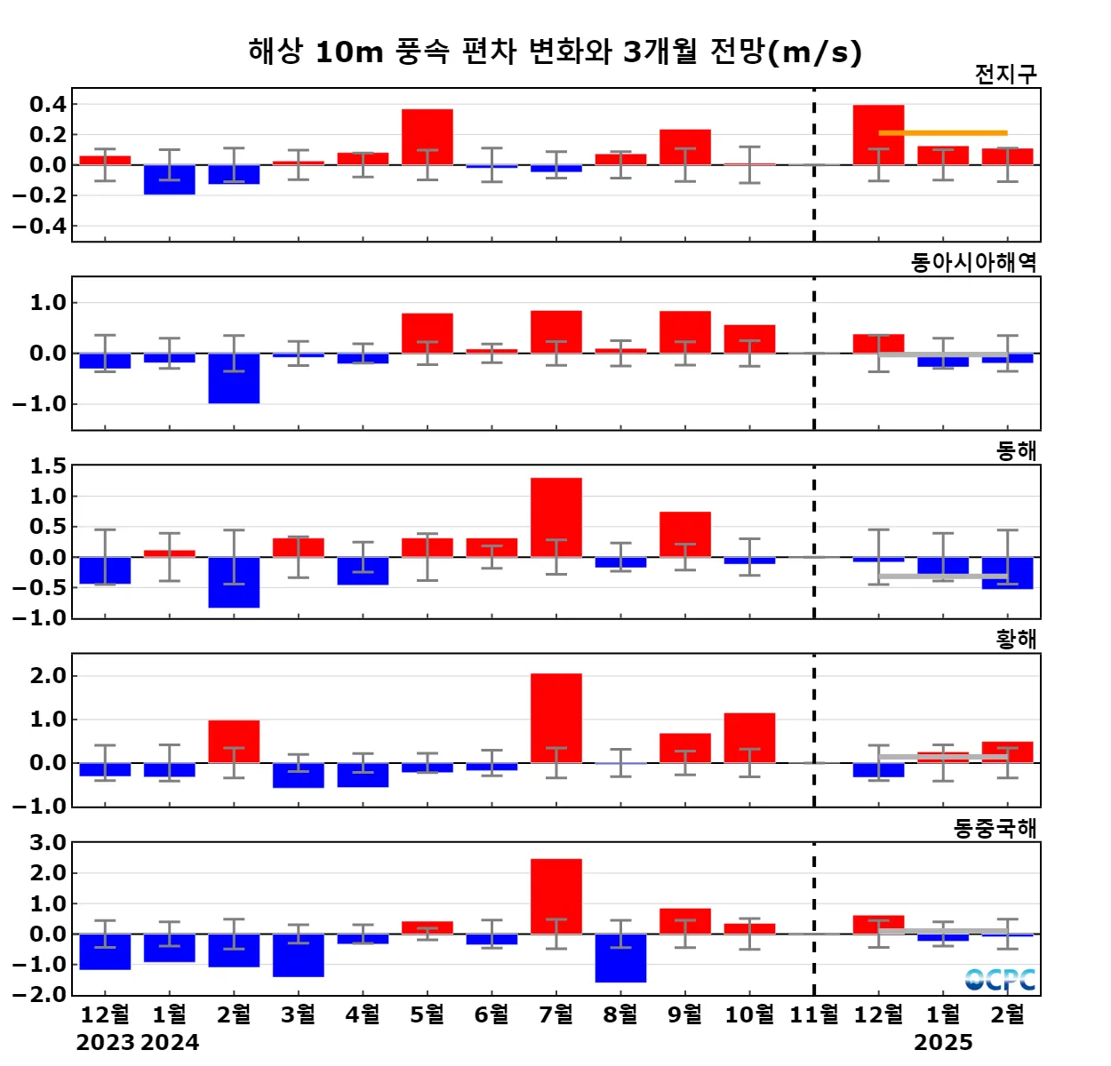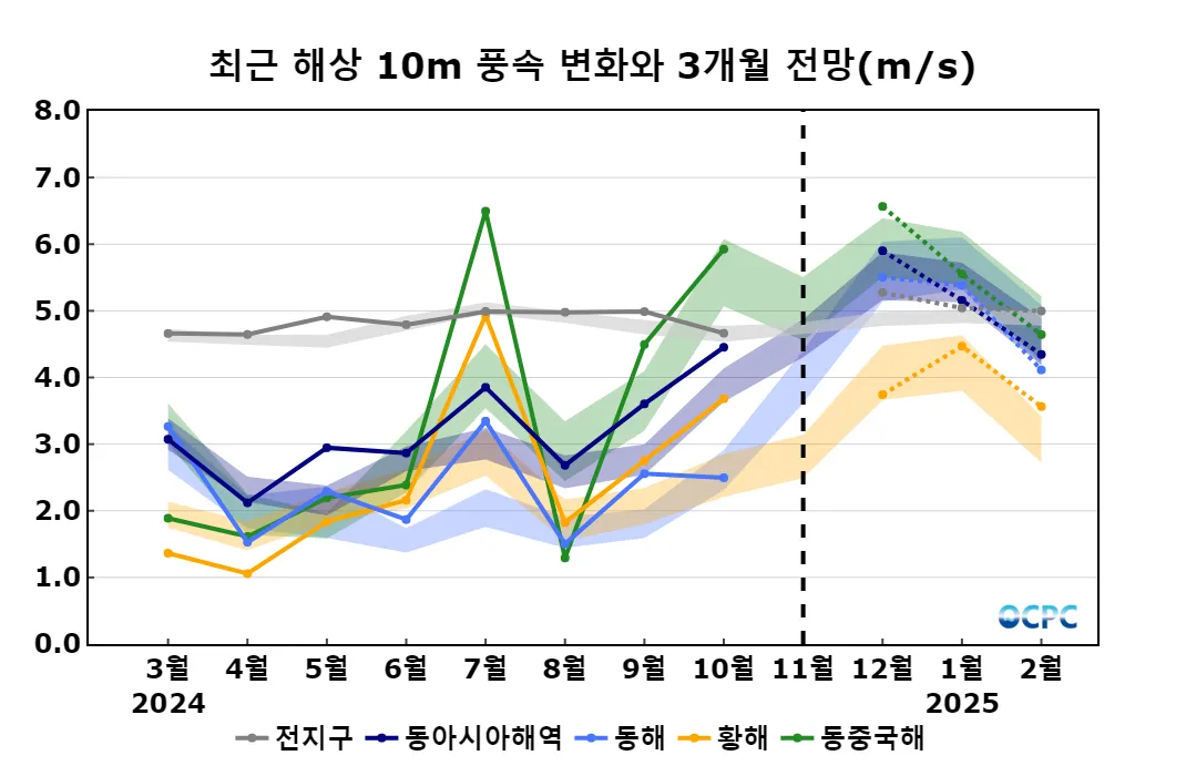 동해, 황해, 동중국해의 2024년 12월~2025년 2월 평균 해상풍은 평년(5.3±0.4m/s, 3.8±0.4m/s, 5.5±0.4m/s)과 비슷하겠습니다.