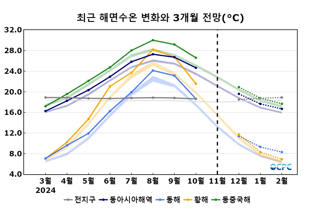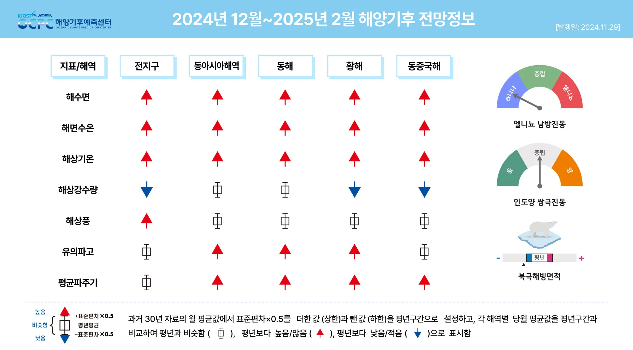 3개월(12, 1, 2월) 평균 전망: 해수면, 해면수온, 해상기온은 전지구, 동아시아해역에서 평년보다 높겠으며, 북극 해빙면적은 평년보다 작겠습니다. 열대 태평양에 라니냐가 발생할 것으로 전망됩니다.