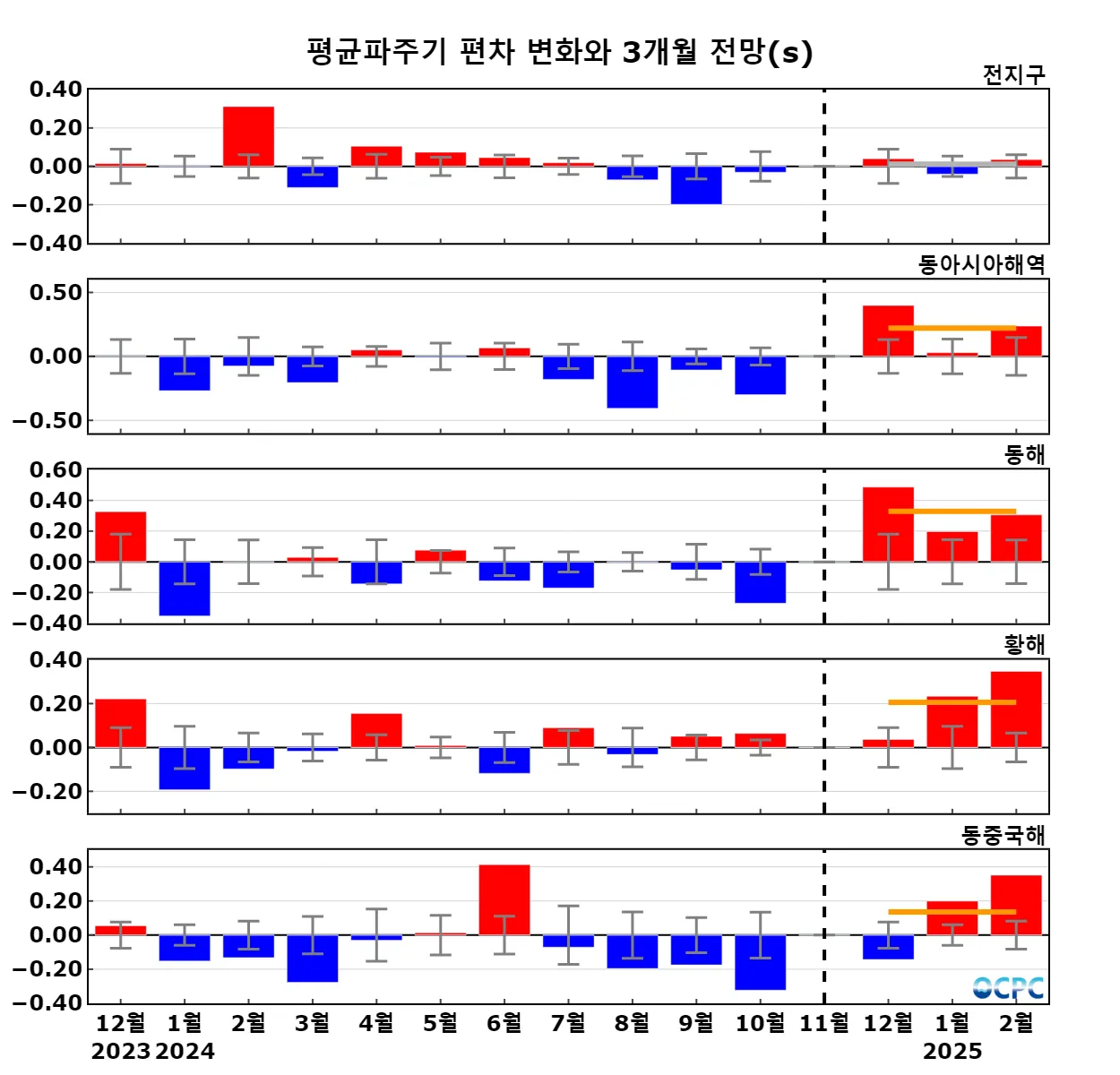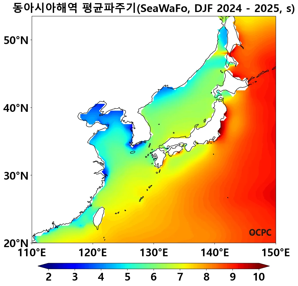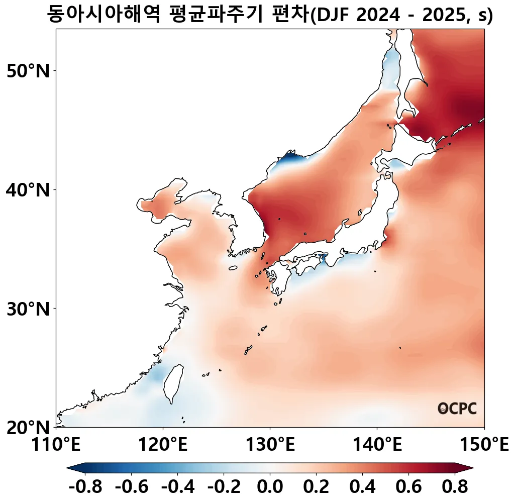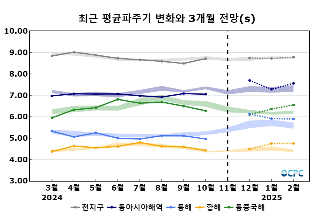 동아시아해역의 2024년 12월~2025년 2월 평균파주기는 평년(7.29±0.14초)보다 증가할 것으로 전망됩니다.
