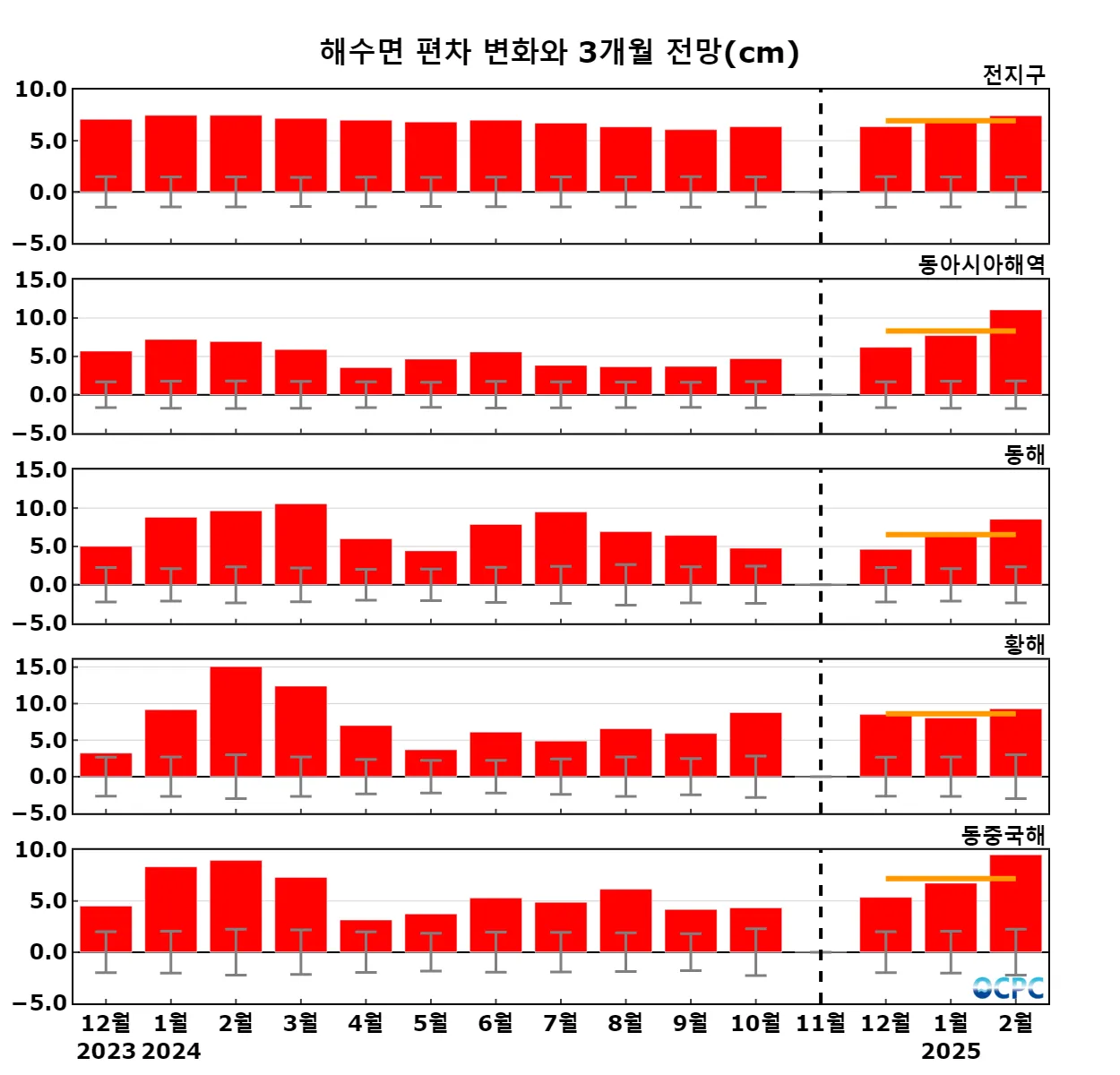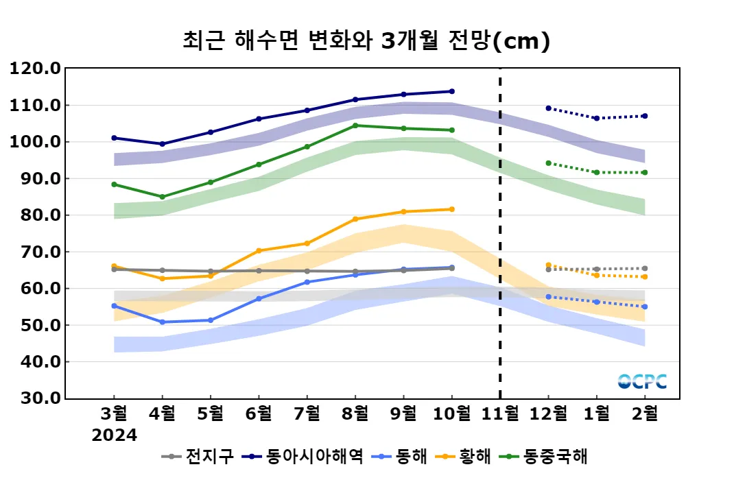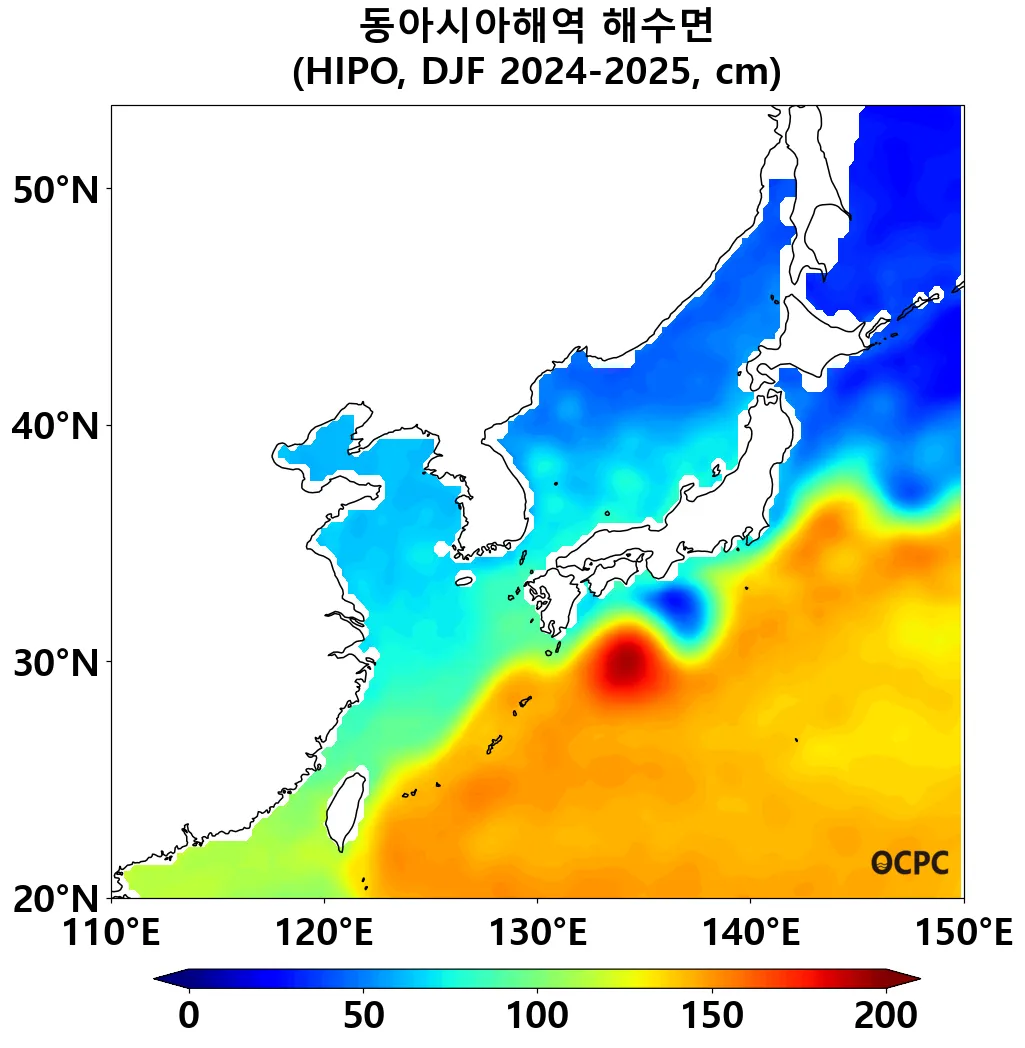 동아시아해역 2024년 12월~2025년 2월 평균 해수면은 평년(99±2cm)보다 높겠습니다.