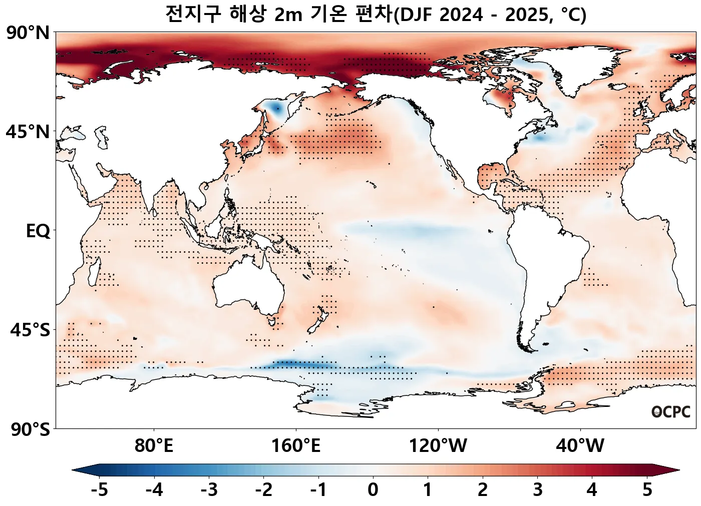 A-B. 전지구 해상기온 편차 전망(2024년 12월~2025년 2월 평균, 점표시: 평년 ±2 표준편차 초과해역)