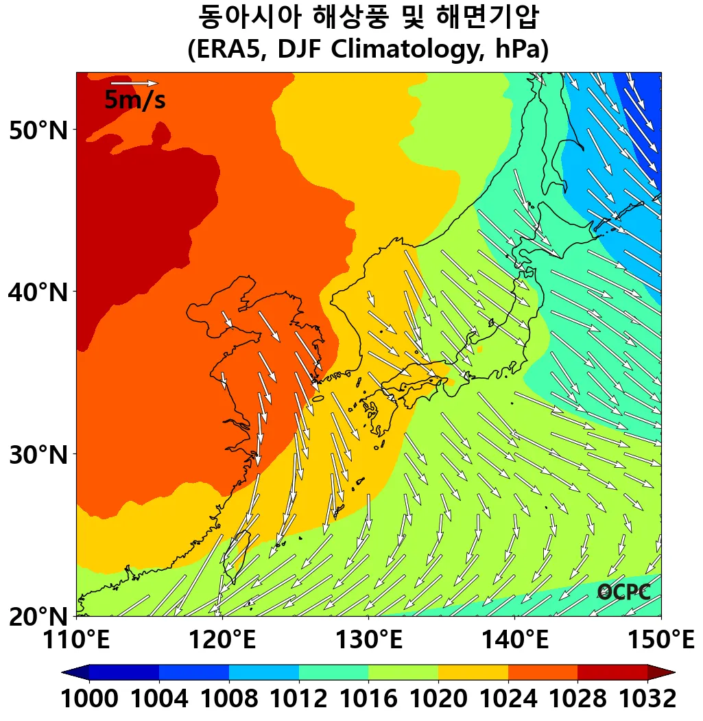 B. 동아시아 해상풍 및 해면기압(평년 12월~2월 평균)