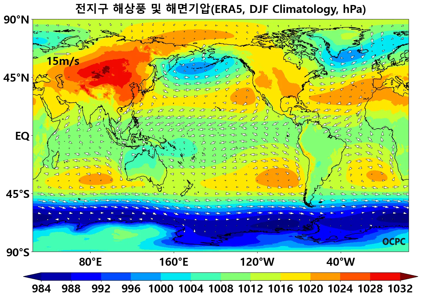 B. 전지구 해상풍 및 해면기압(평년 12월~2월 평균)