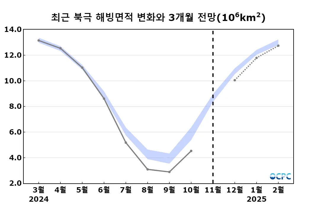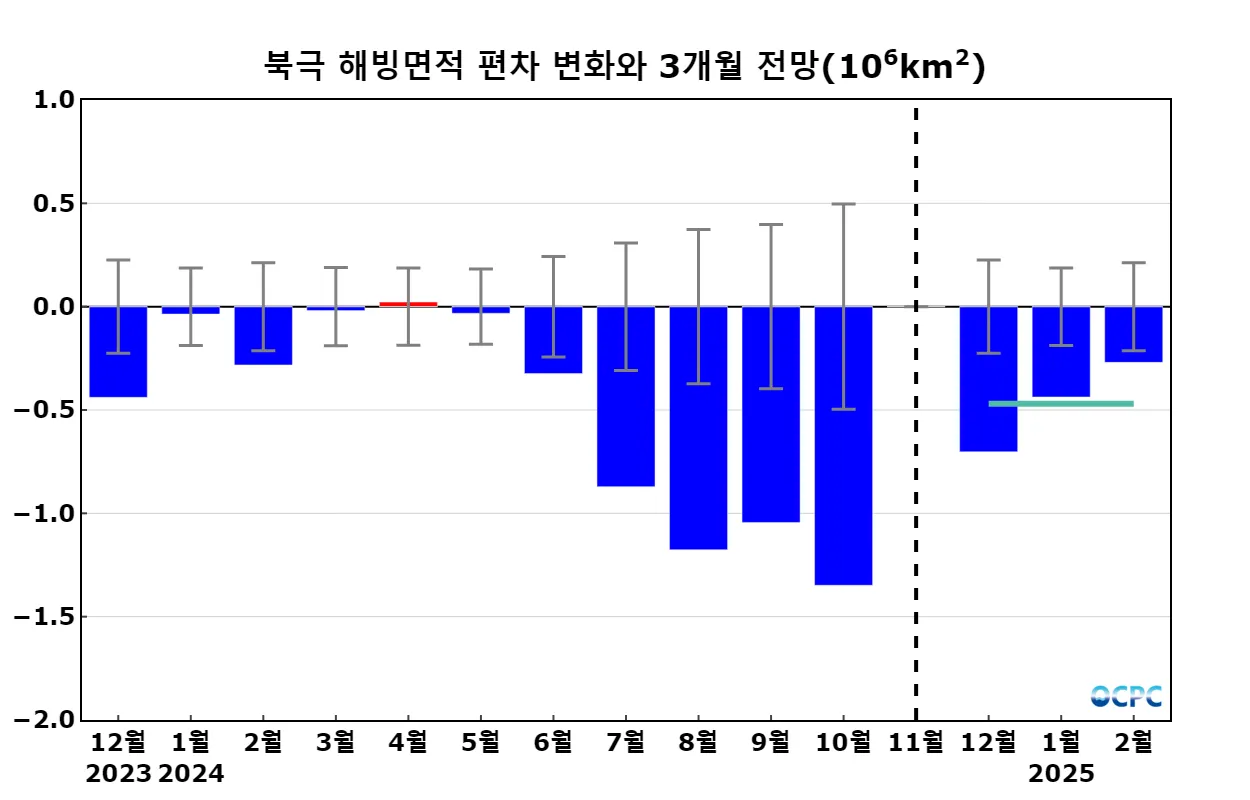 북극 2024년 12월~2025년 2월 평균 해빙면적은 평년(1,200만±21만km²)보다 감소할 것으로 전망됩니다.