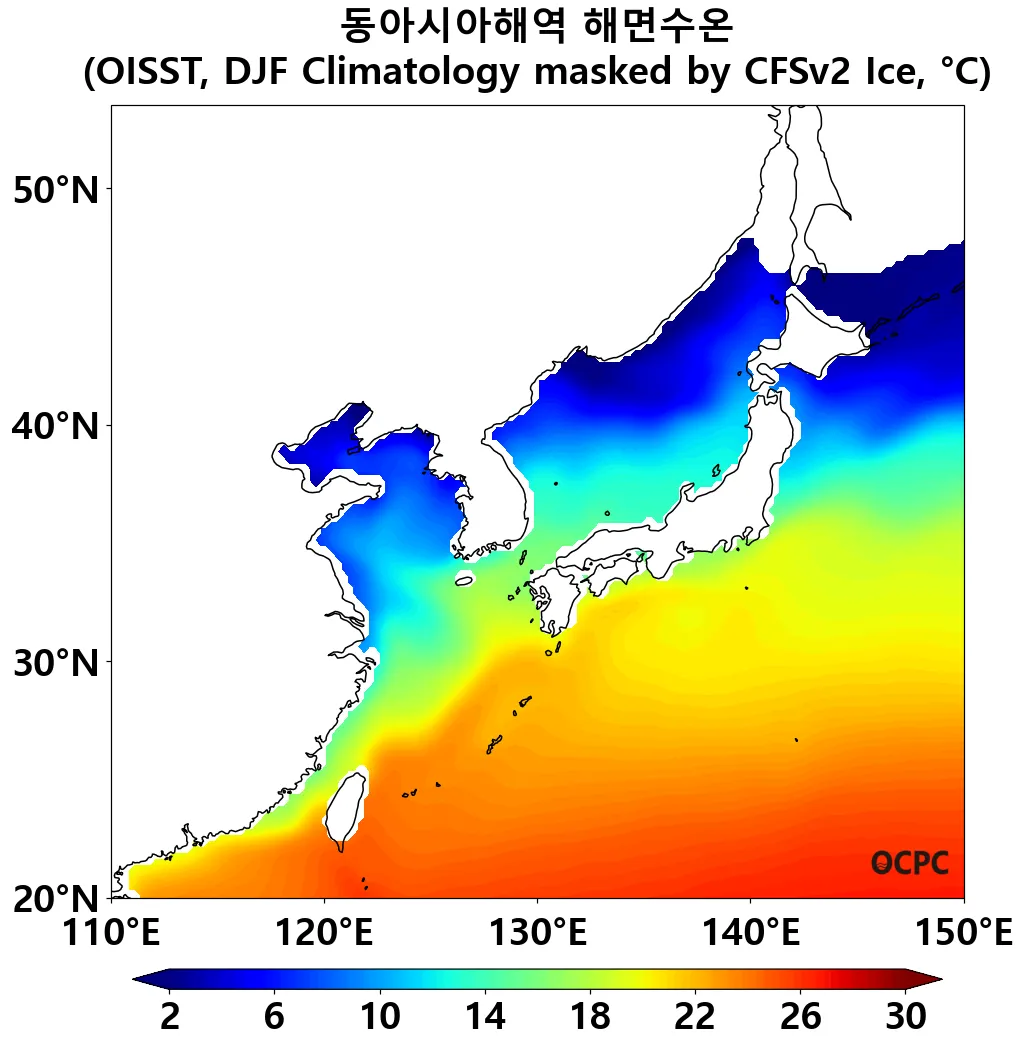 B. 동아시아해역 해면수온(평년 12월~2월 평균), 예상 해빙 해역 제외