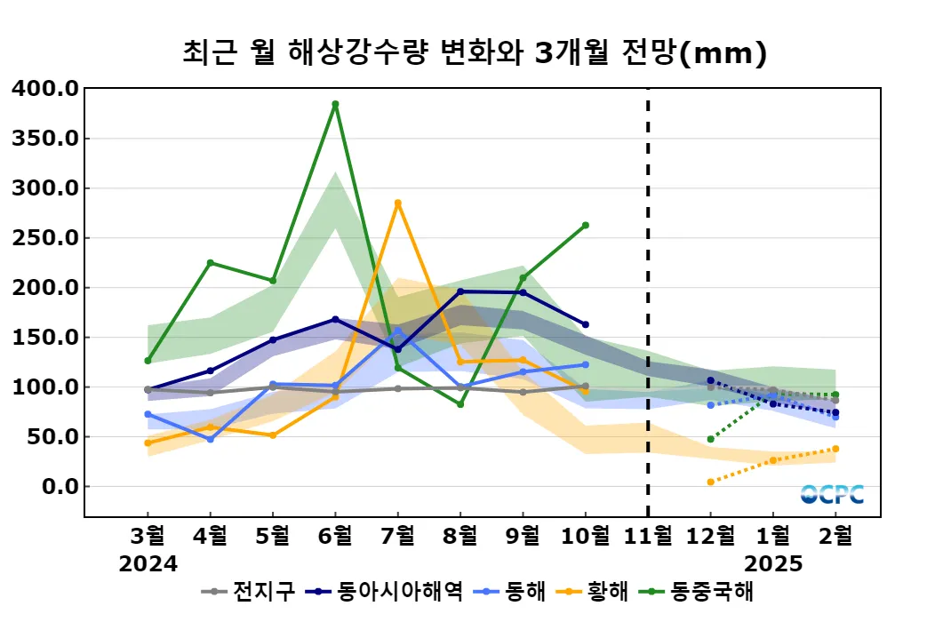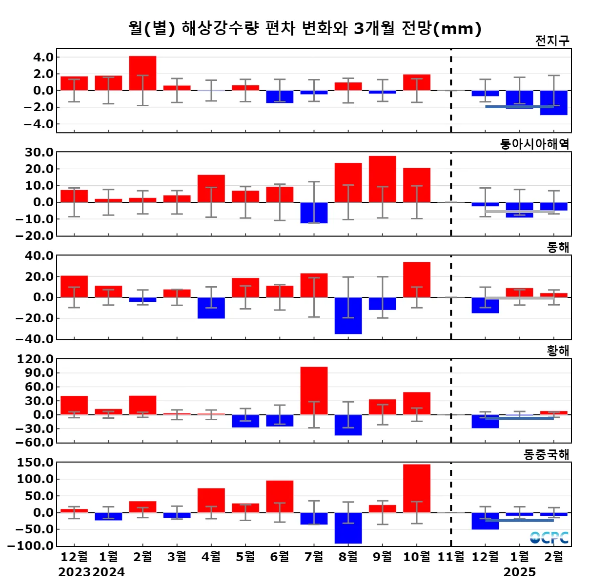 2024년 12월~2025년 2월 황해, 동중국해의 평균 해상강수량은 평년(81.9±8.1mm, 30.4±6.3mm)보다 적겠으며, 동해의 평균 해상강수량은 평년(101.5±16.7mm)과 비슷하겠습니다.