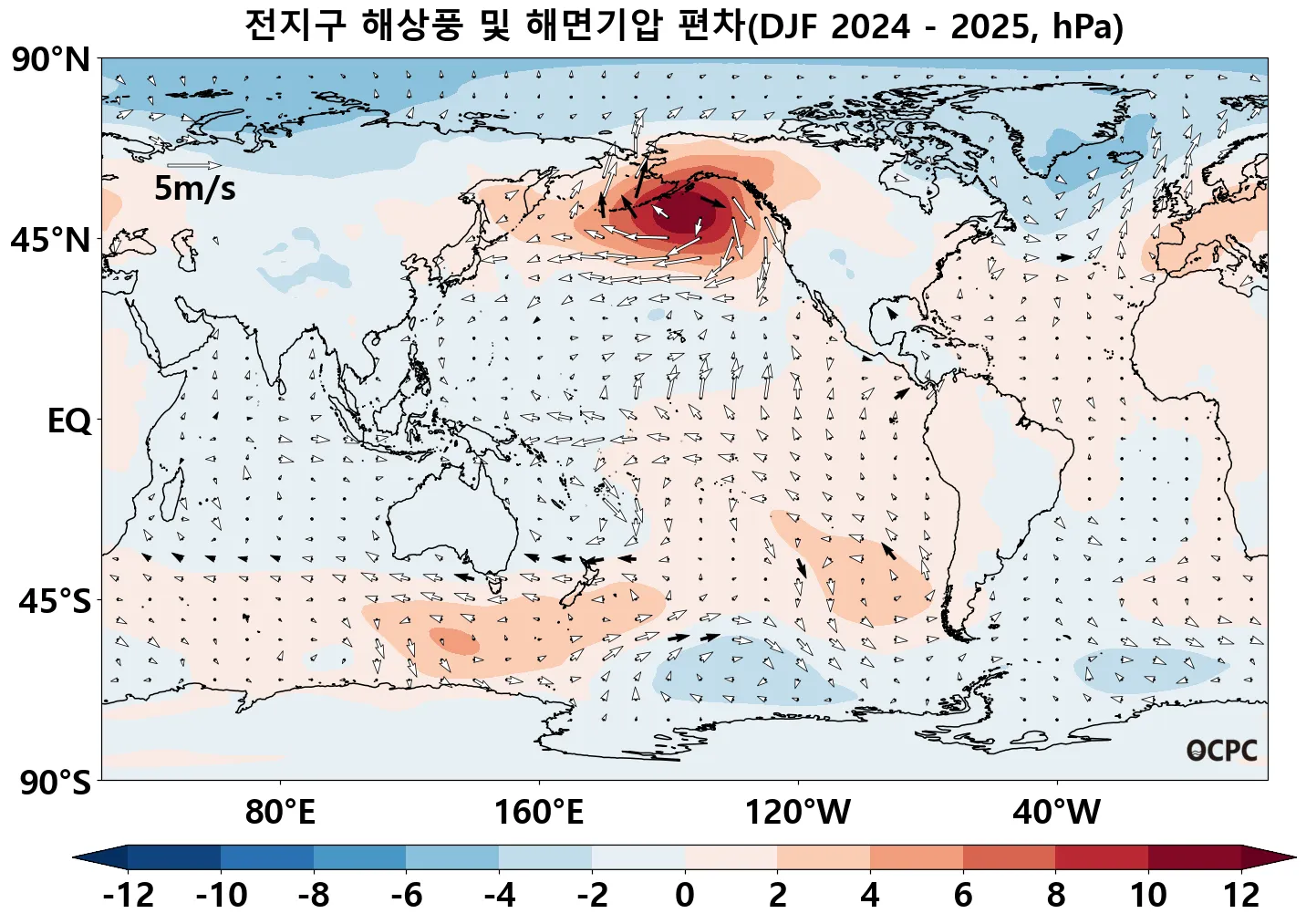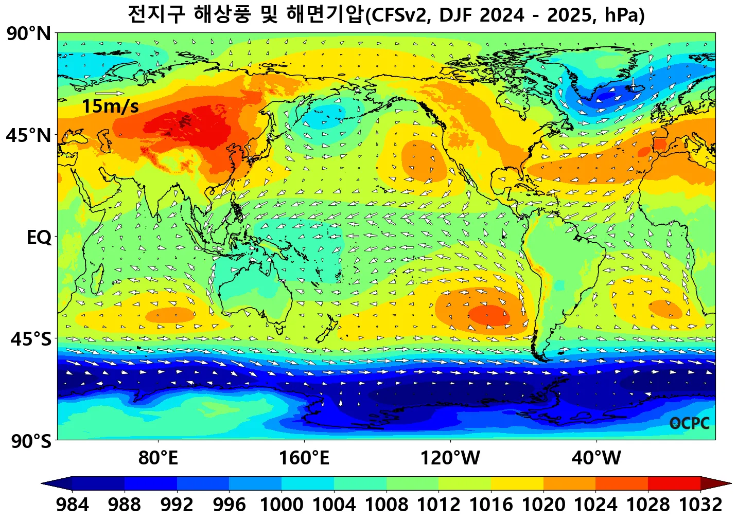 A. 전지구 해상풍 및 해면기압 전망(2024년 12월~2025년 2월 평균)
