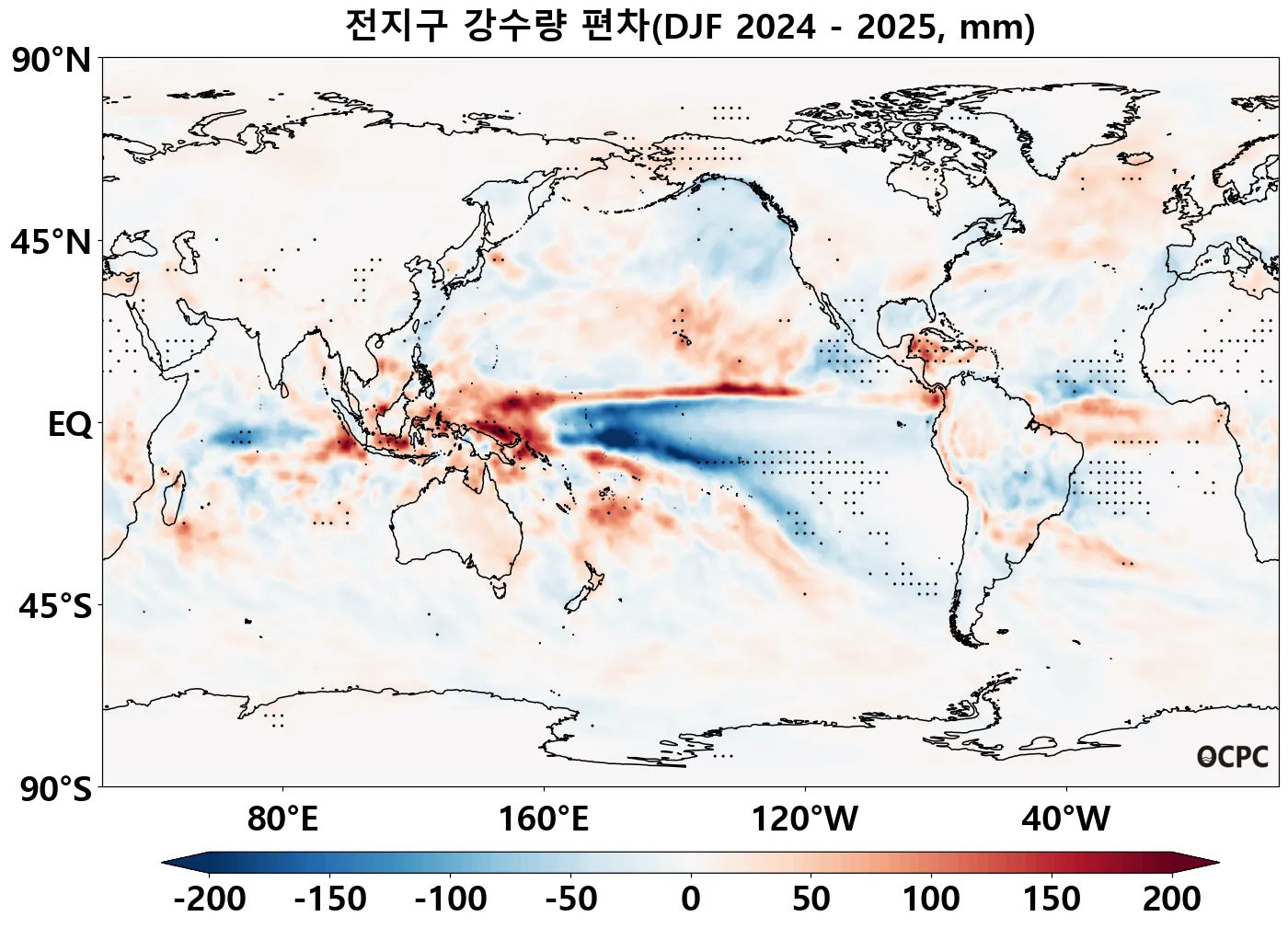 A-B. 전지구 강수량 편차 전망(2024년 12월~2025년 2월 평균, 점표시: 평년 ±2 표준편차 초과해역)