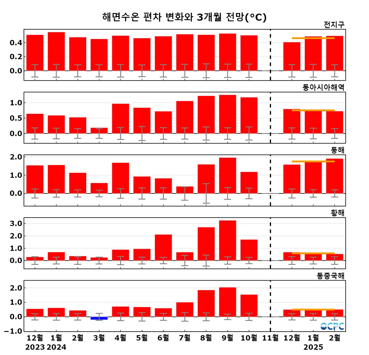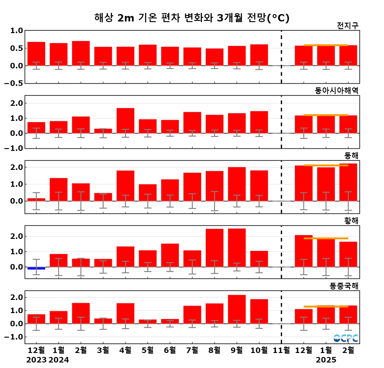 동해, 황해, 동중국해 2024년 12월~2025년 2월 평균 해면수온은 평년(7.9±0.2℃, 8.4±0.3℃, 18.6±0.2℃)보다 1.8℃, 0.6℃, 0.5℃ 높겠습니다.