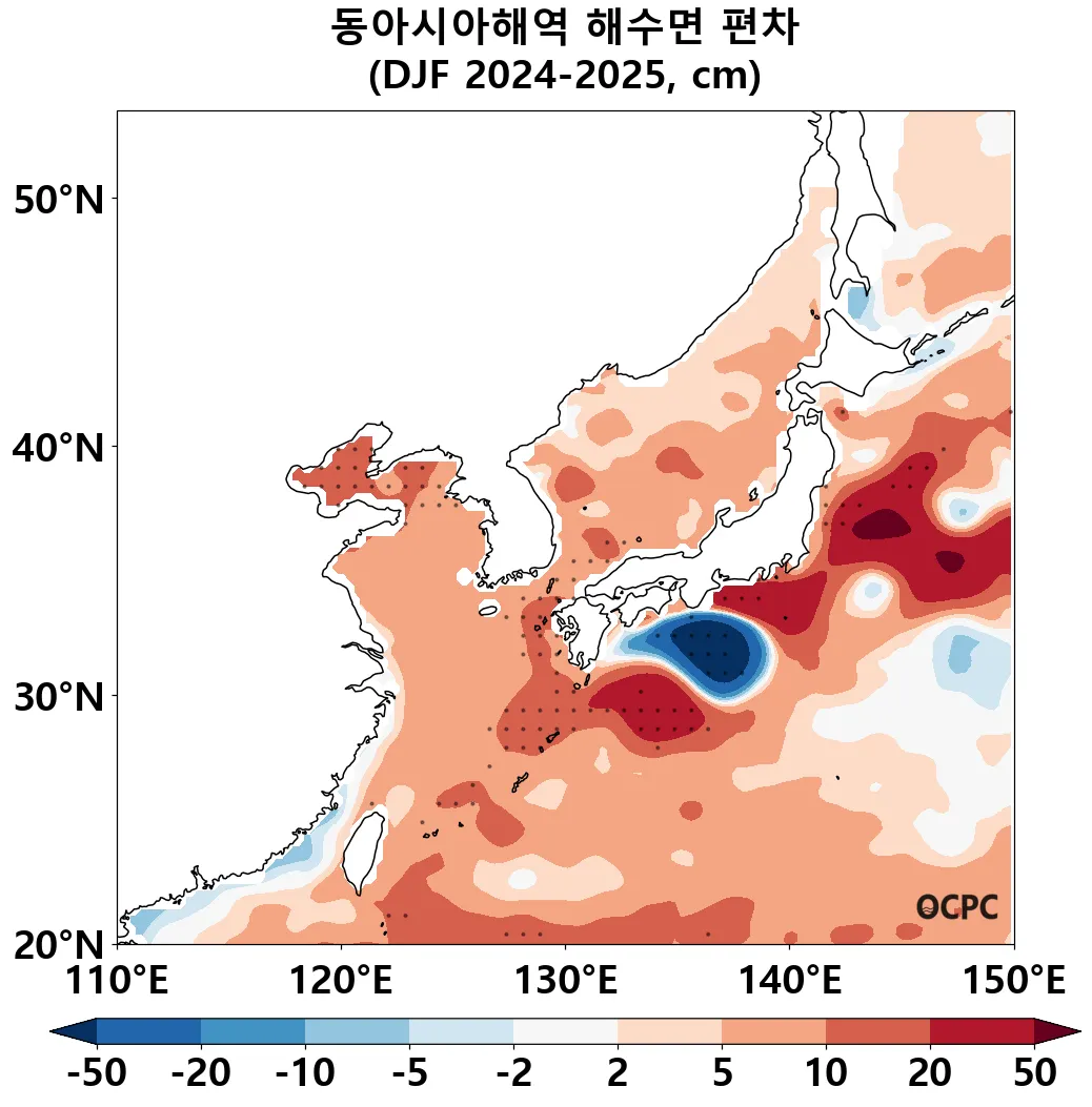 동해, 황해, 동중국해의 2024년 12월~2025년 2월 평균 해수면은 평년(50±2cm, 56±3cm, 85±2cm)보다 높겠습니다.