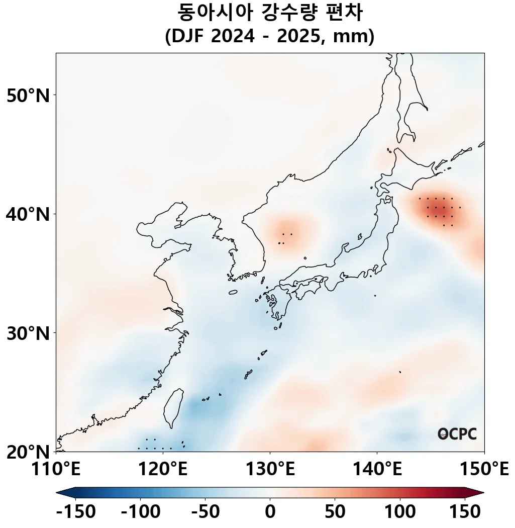 A-B. 동아시아 강수량 편차 전망(2024년 12월~2025년 2월 평균점표시: 평년 ±2 표준편차 초과해역)
