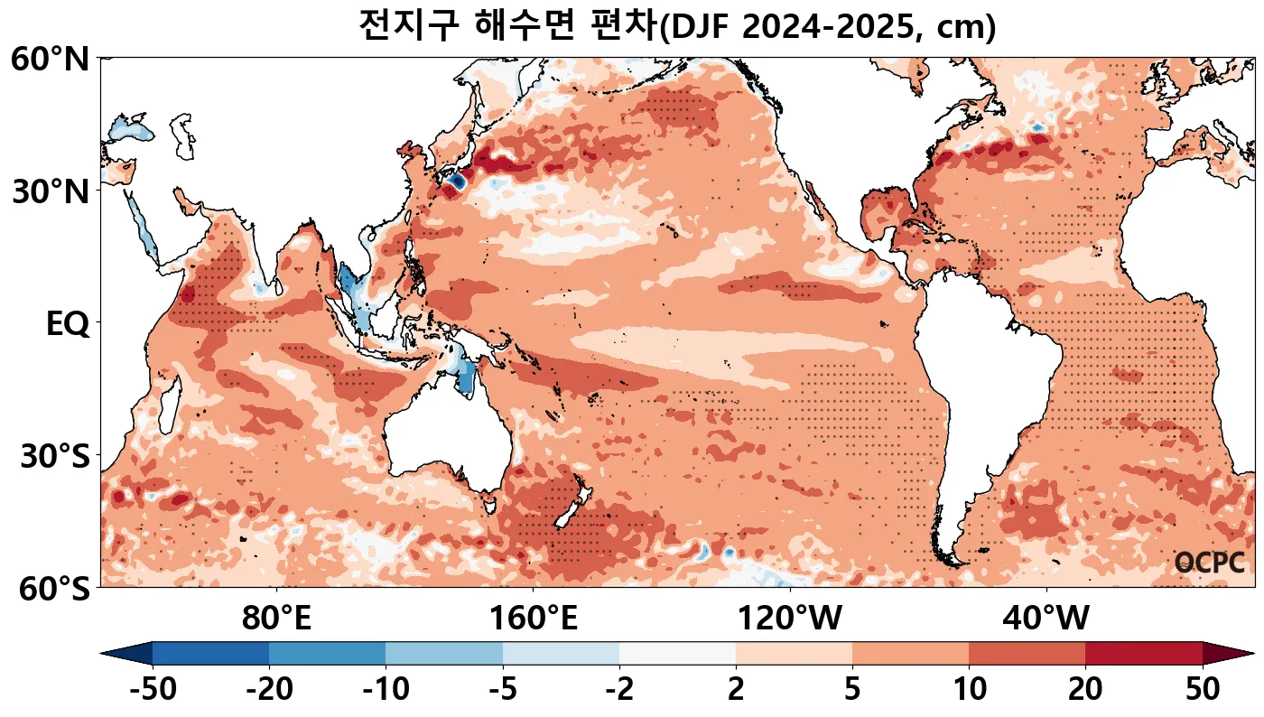 전지구 2024년 12월~2025년 2월 평균 해수면은 평년(58±1cm)보다 높겠으며, 열대 서인도양 및 남대서양, 중위도 북동태평양 및 뉴질랜드 인근 해역에서 평년 2 표준편차를 초과하는 높은 해수면 편차가 전망됩니다.