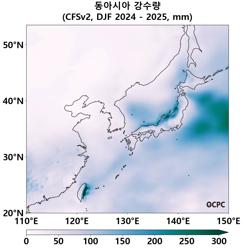 A. 동아시아 강수량 전망(2024년 12월~2025년 2월 평균)