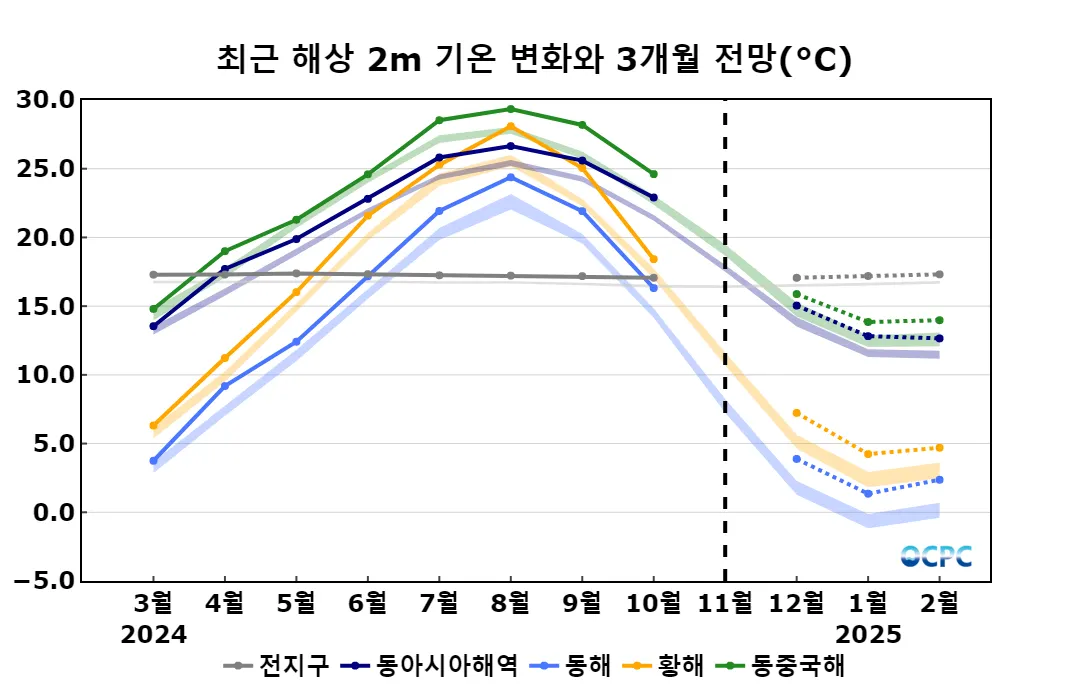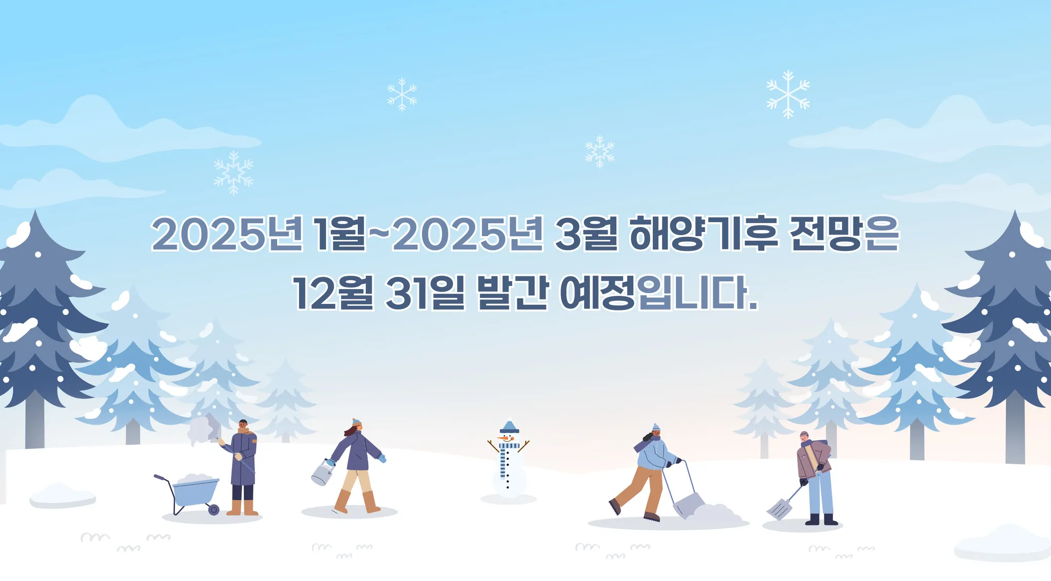 동해, 황해, 동중국해의 2024년 12월~2025년 2월 평균 해상기온은 평년(0.4±0.5℃, 3.5±0.5℃, 13.3±0.5℃)보다 높겠습니다.