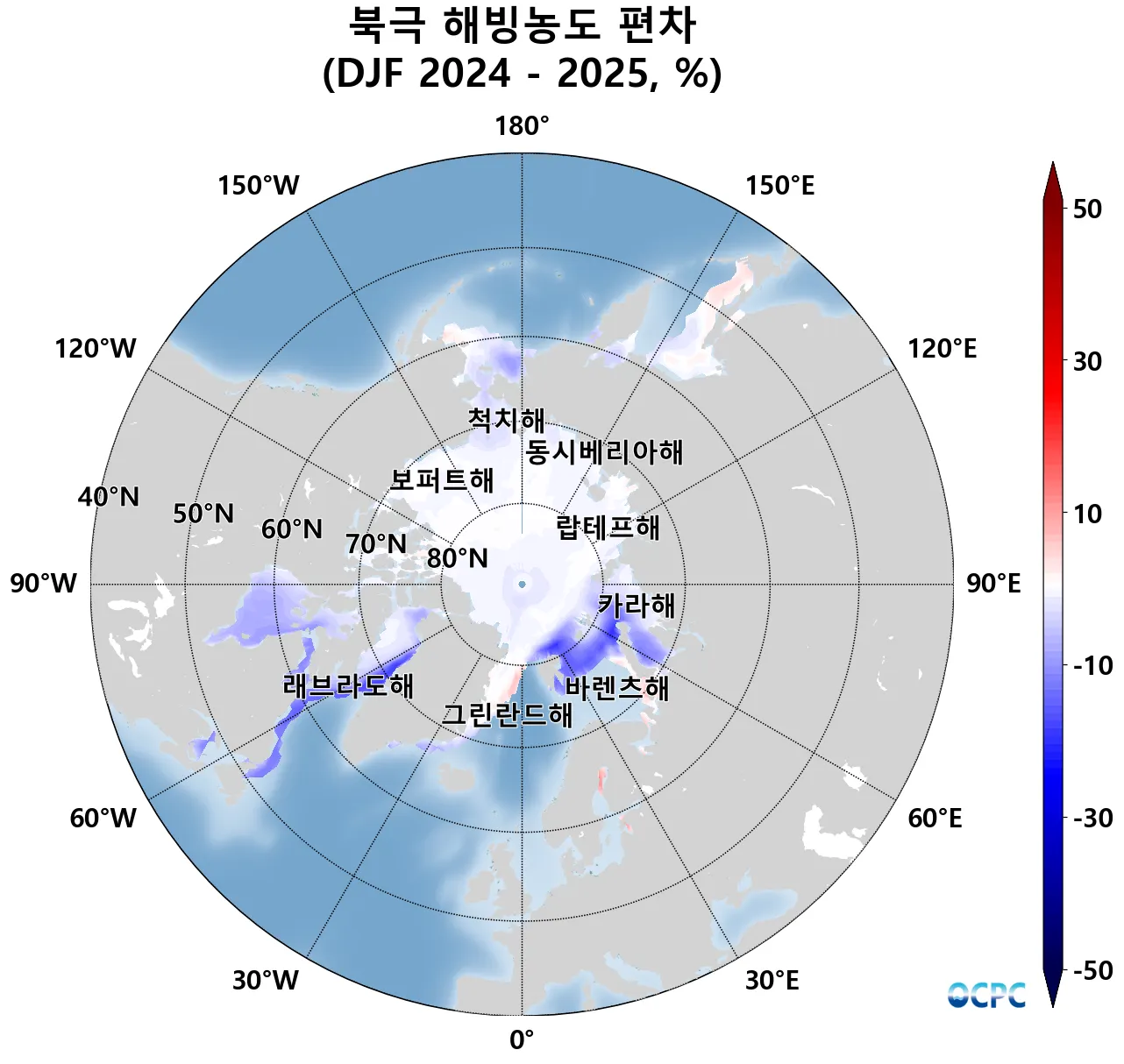 바렌츠해, 카라해, 래브라도해의 해빙이 느리게 증가할 것으로 전망되며, 특히 바렌츠-카라해의 해빙 감소 및 온난화는 겨울철 동아시아지역의 한파 발생 증가에 영향을 미칠 수 있습니다.