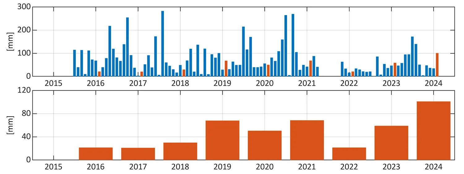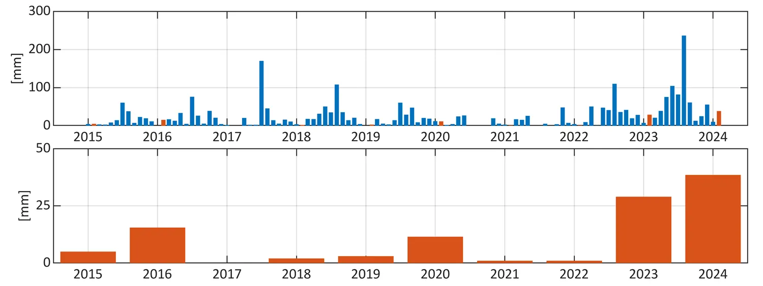 2015~2024년 이어도 해양과학기지 월누적 강수량(위)과 2월 강수량 변화