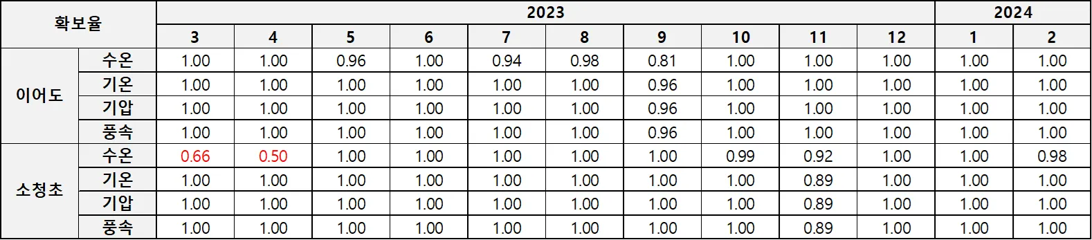 해양과학기지 관측자료 월별 확보율(2023-2024)
