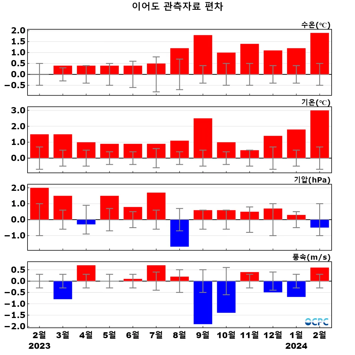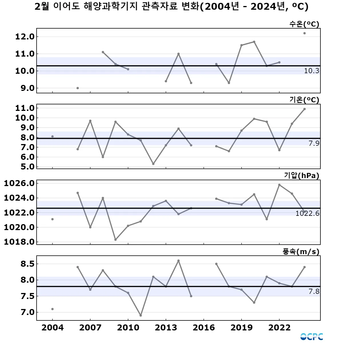 이어도 기지의 2월 평균 수온(12.2℃)과 기온(10.9℃)은 관측기간 중 가장 높았습니다.