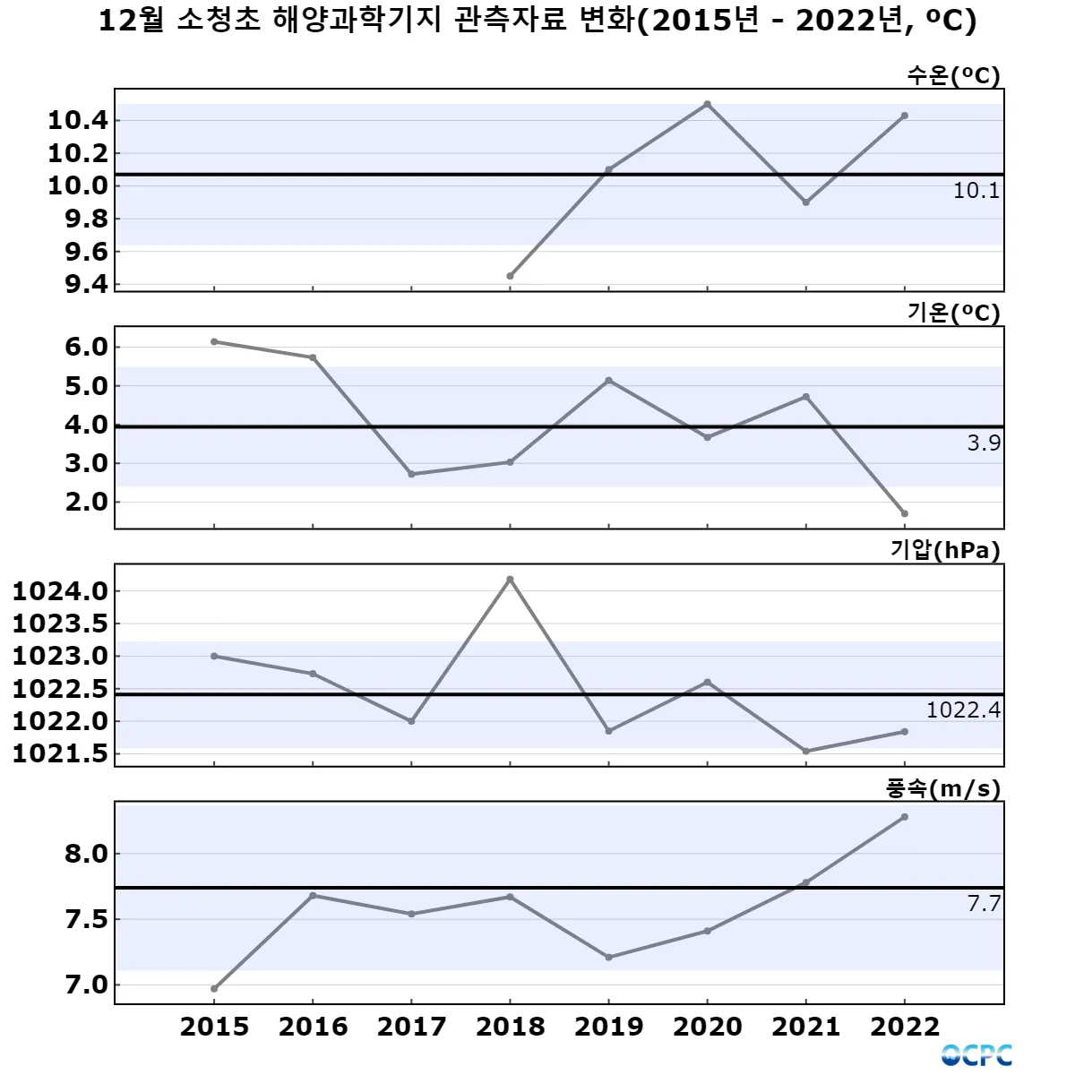 소청초 기지의 2015~2022년(12월) 평균 기압(1021.8hPa)은 2021년(1021.5hPa)에 이어 두번째로 낮았고, 풍속(8.3m/s)은 가장 높았습니다.