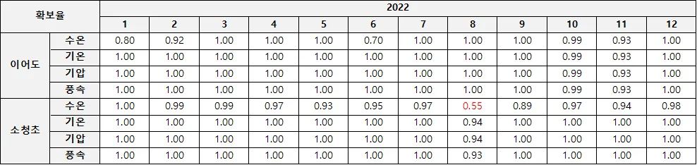 해양과학기지 관측요소별 관측자료 월별 확보율(2022). 최대가 1.0이며 붉은색은 월 확보율 0.8(수온은 0.7) 미만인 자료로 분석에서 제외