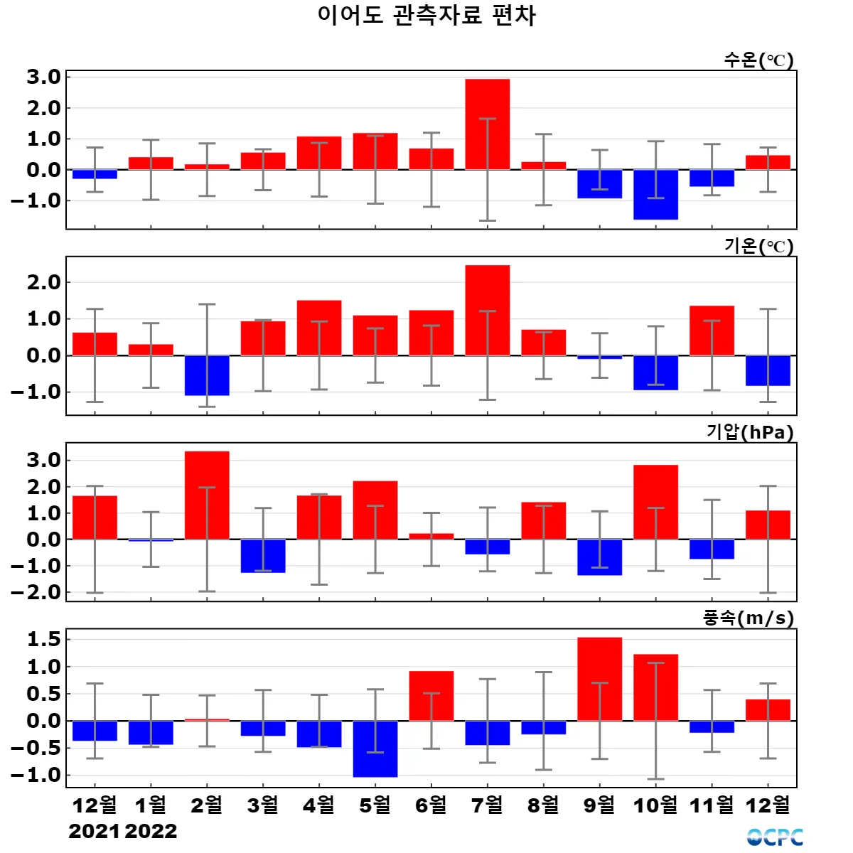 이어도 기지의 2004~2022년(12월) 평균 수온, 기온, 기압, 풍속은 관측기간 평균(12월)과 비슷했습니다.