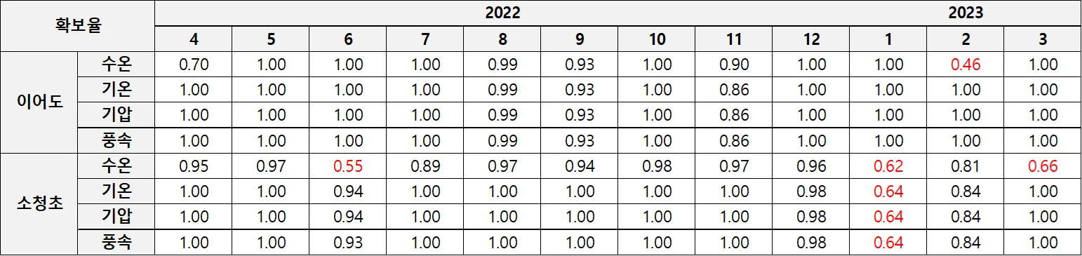 해양과학기지 관측요소별 관측자료 월별 확보율(2022). 최대가 1.0이며 붉은색은 월 확보율 0.8(수온은 0.7) 미만인 자료로 분석에서 제외