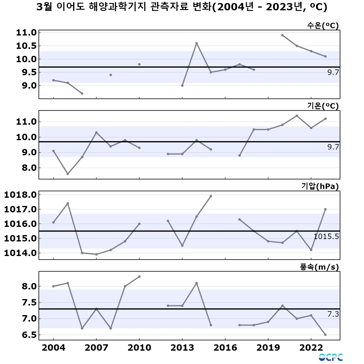 이어도 기지의 3월 평균기온은 2004-2023년(3월) 중 두번째로 높았습니다(2021년 11.4℃, 2023년 11.2℃).