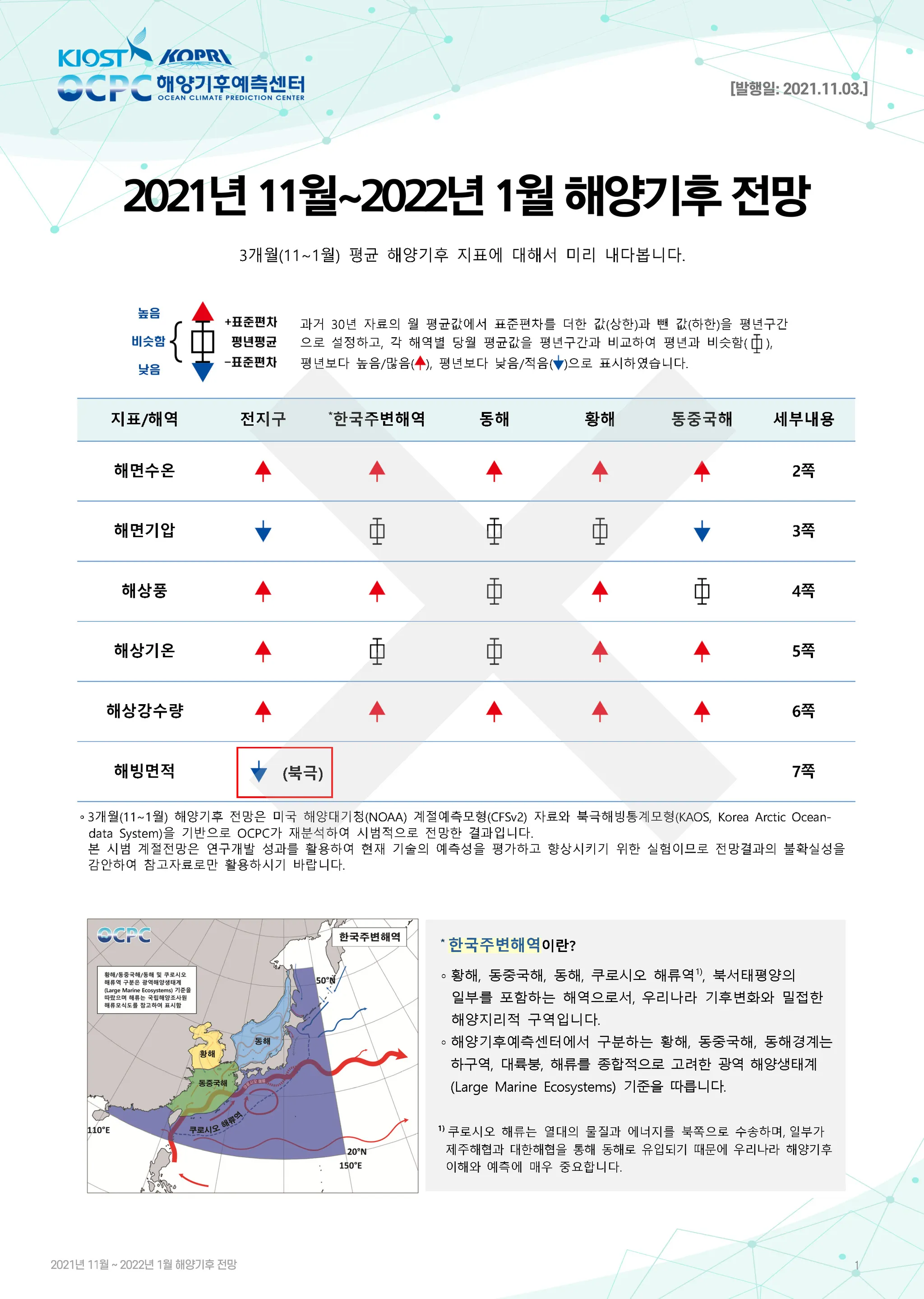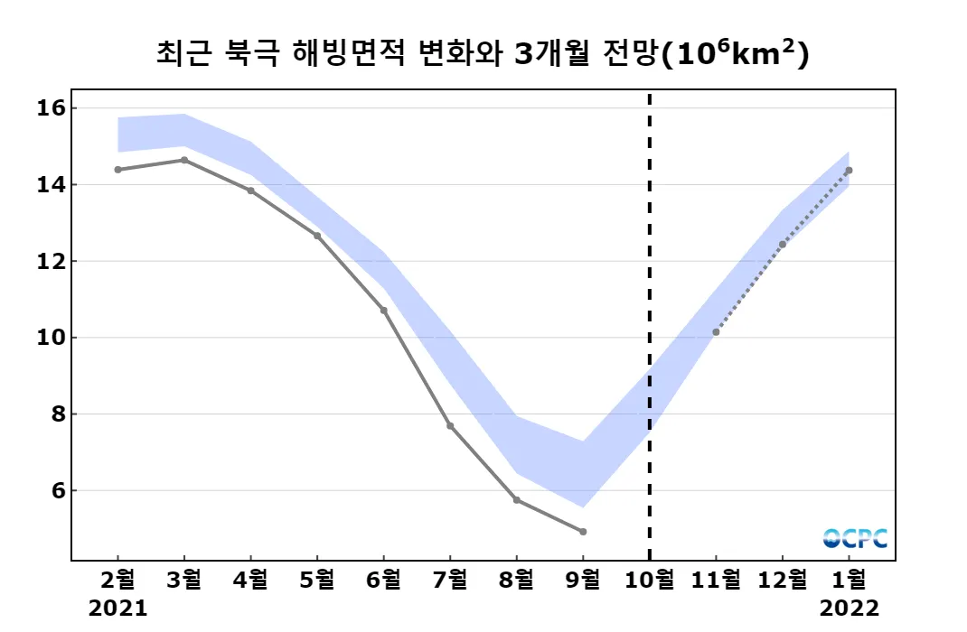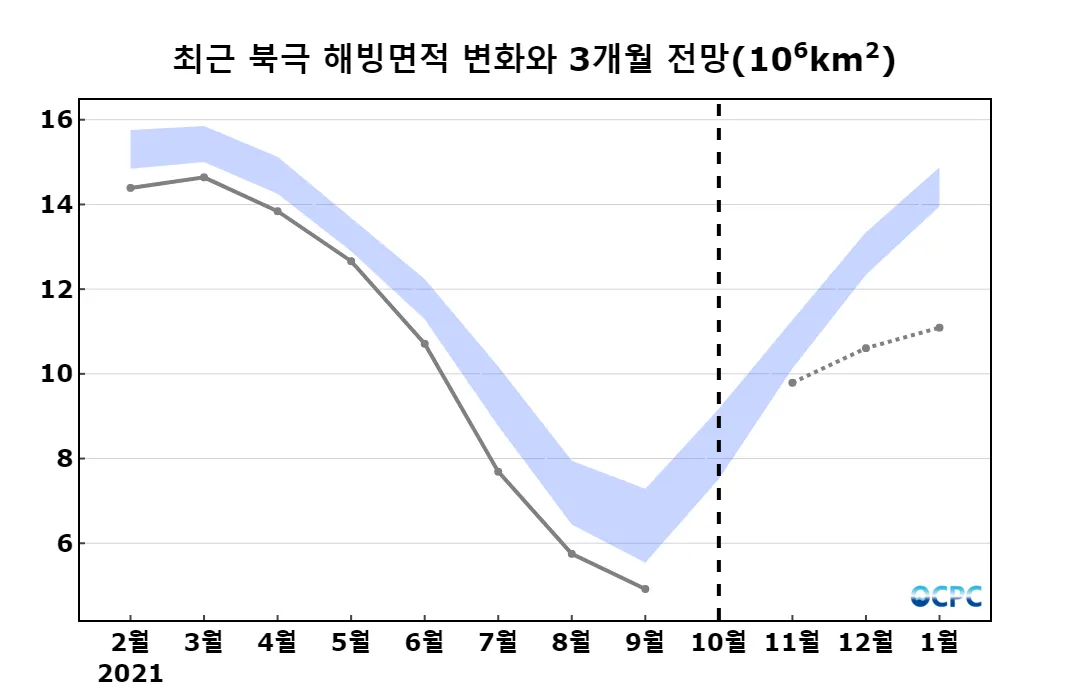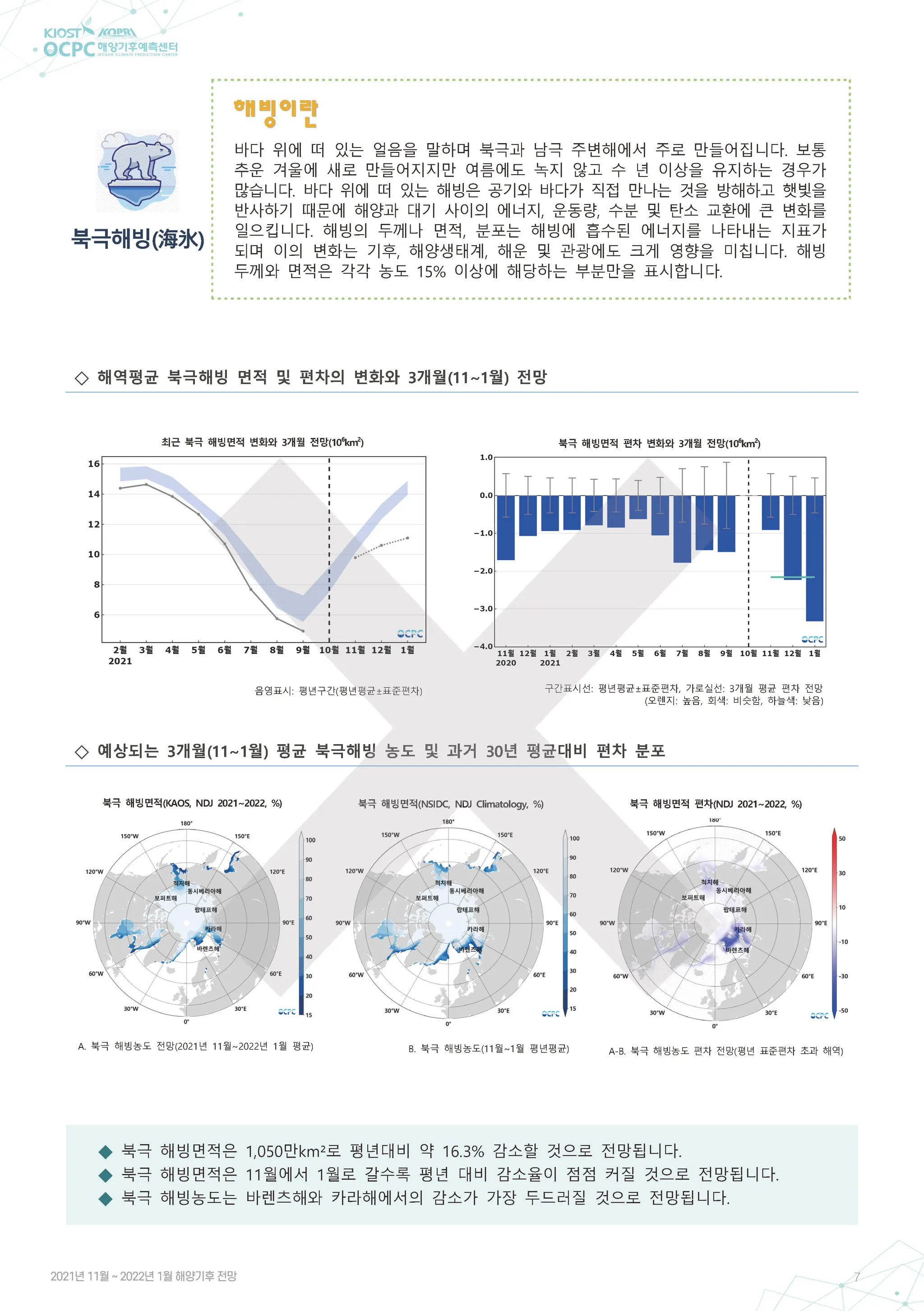 북극 해빙면적은 1,050km²로 평년대비 약 16.3% 감소할 것으로 전망됩니다.