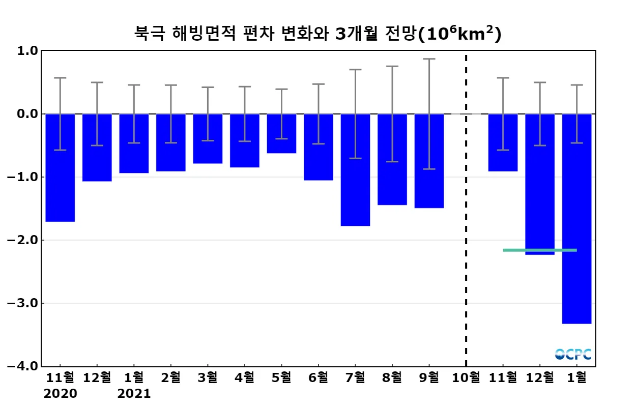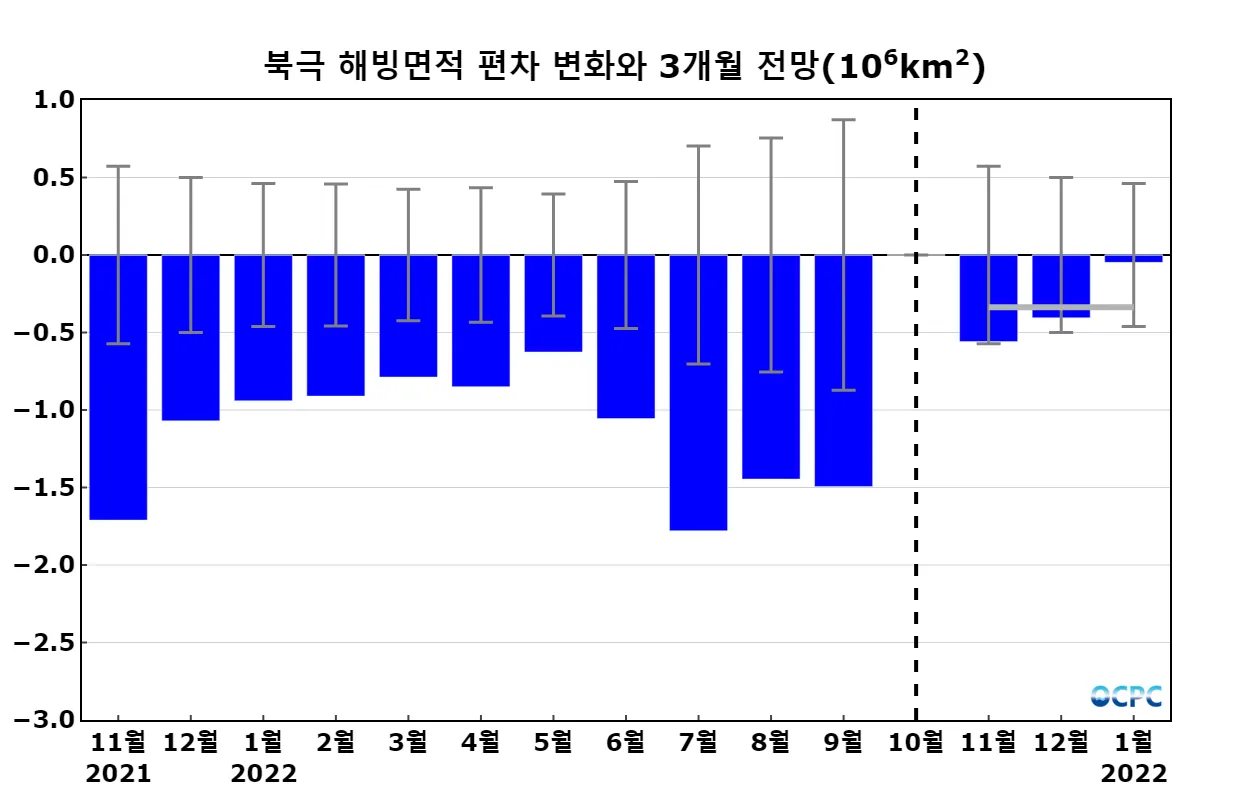 북극 해빙면적은 11월에서 1월로 갈수록 평년 대비 감소율이 점점 커질 것으로 전망됩니다.,