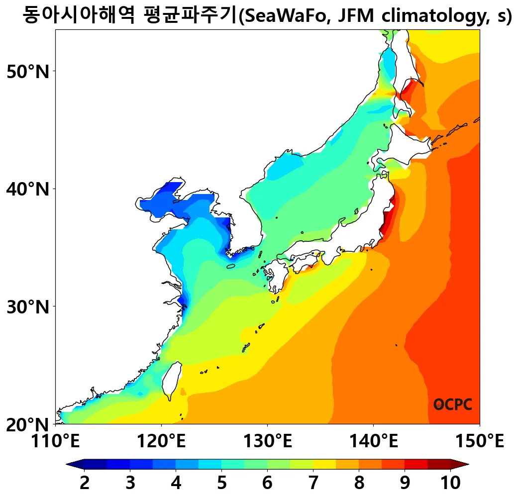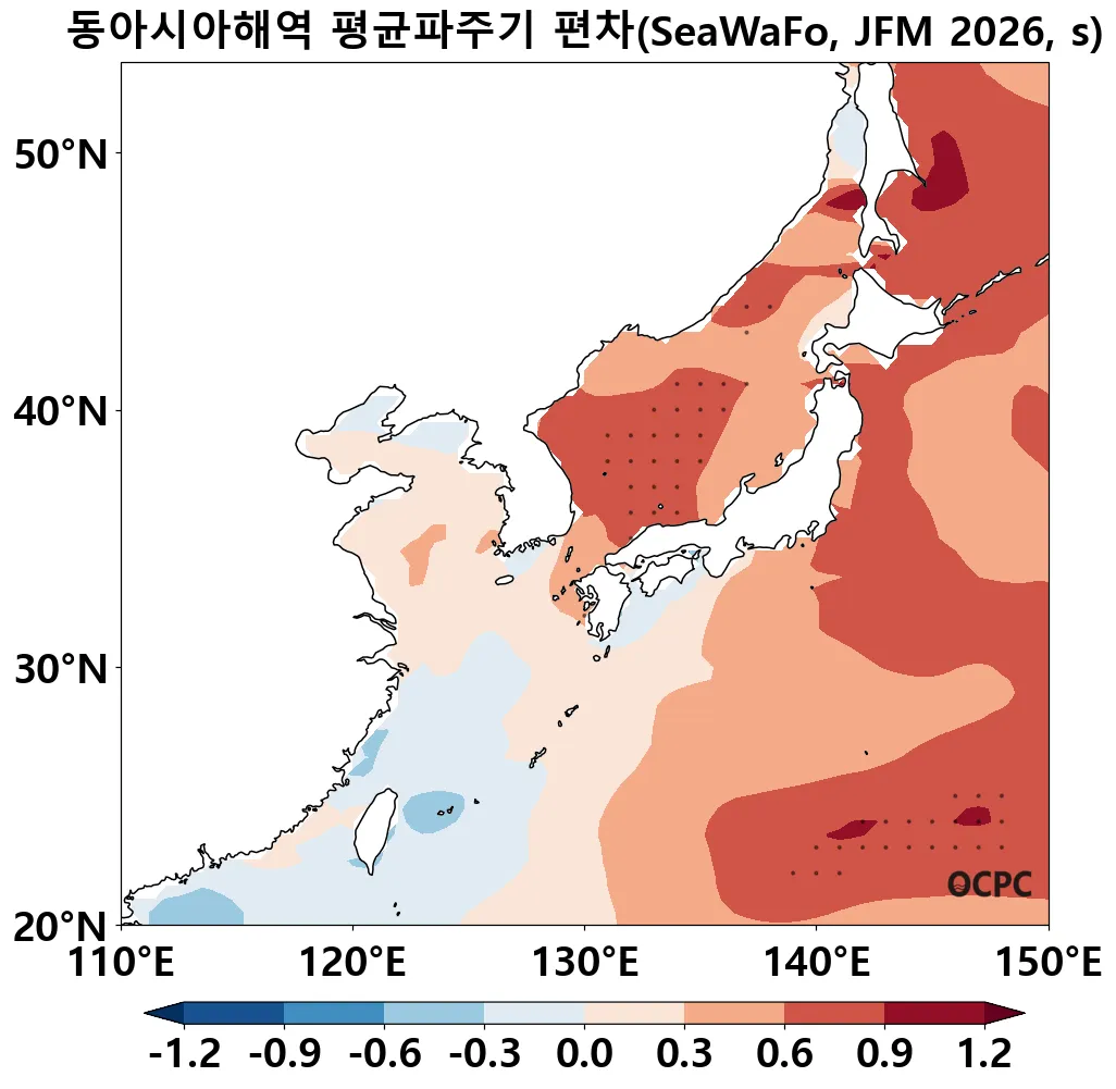 동아시아해역의 2026년 1~3월 평균파주기는 평년(7.25±0.12초)보다 길 것으로 전망됩니다. 평균파주기도 유의파고와 유사하게 1월부터 3월로 갈수록 점진적인 증가 경향을 보일 것으로 예상되며, 특히 동해와 일본 남동부 해역에서는 평년 2 표준편차를 초과하는 해역이 나타날 것으로 전망됩니다.