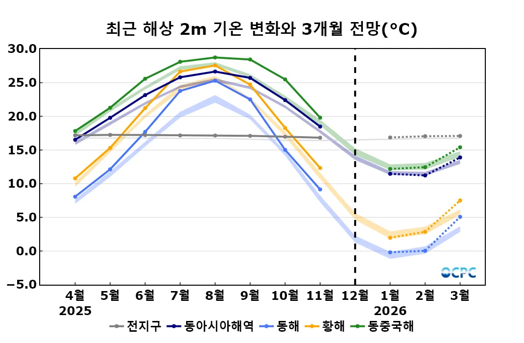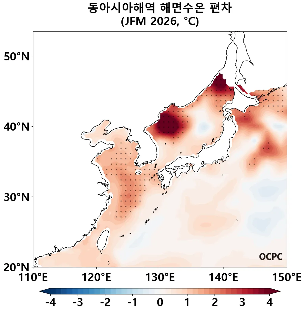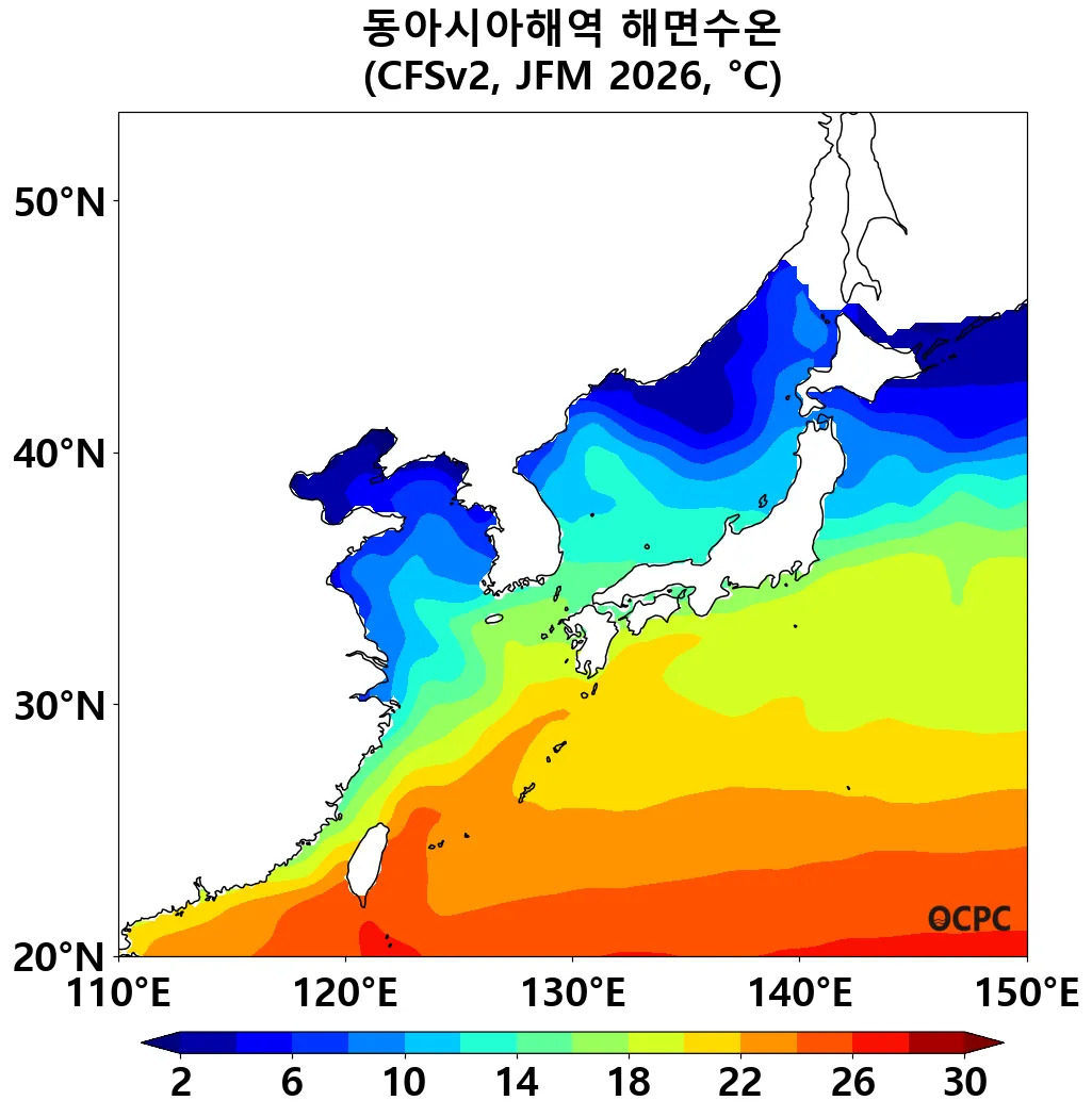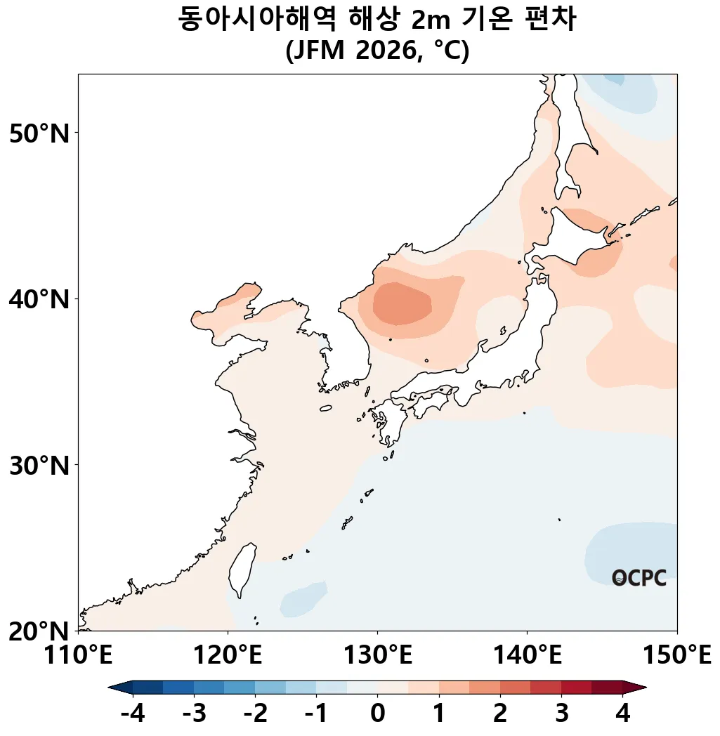 동해의 2026년 1월~3월 평균 해상기온은 평년(0.9±0.5℃)보다 높겠습니다. 황해, 동중국해의 2026년 1월~3월 평균 해상기온은 평년(3.7±0.5℃, 13.1±0.4℃)과 비슷하겠습니다.