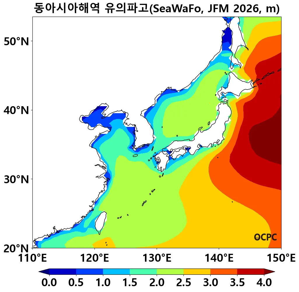A. 동아시아해역 유의파고 전망(2026년 1월~3월 평균)