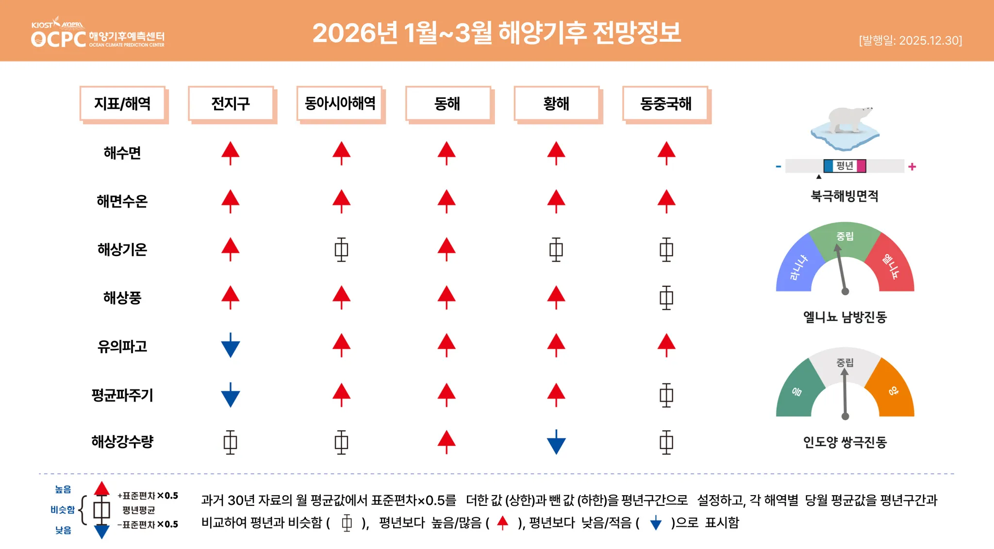 3개월(2026년 1~3월): 전지구 해수면, 해면수온, 해상기온은 평년보다 높겠습니다. Nino3.4 해역은 중립으로 전망되나, 해면기압 및 해상강수량은 라니냐의 영향을 보일 것으로 전망됩니다. 북극 해빙 면적은 평년보다 작을 것으로 전망됩니다.