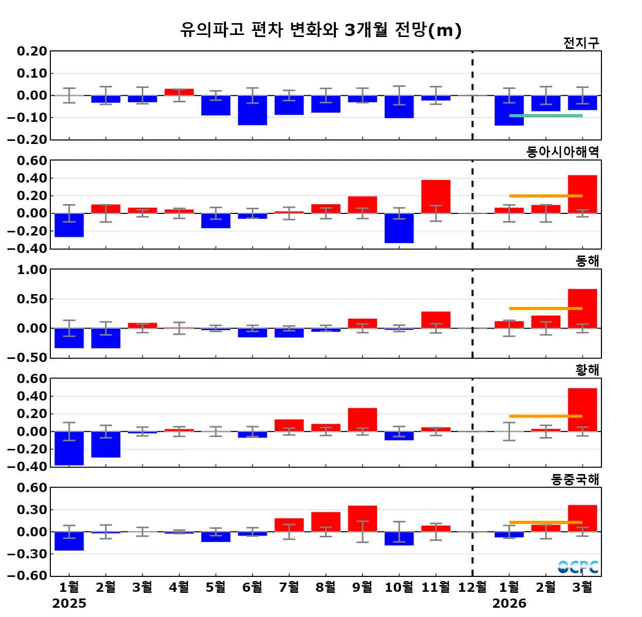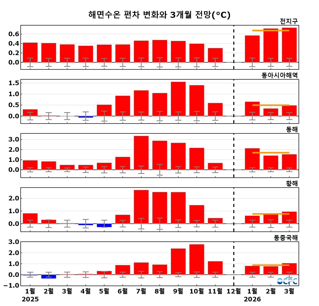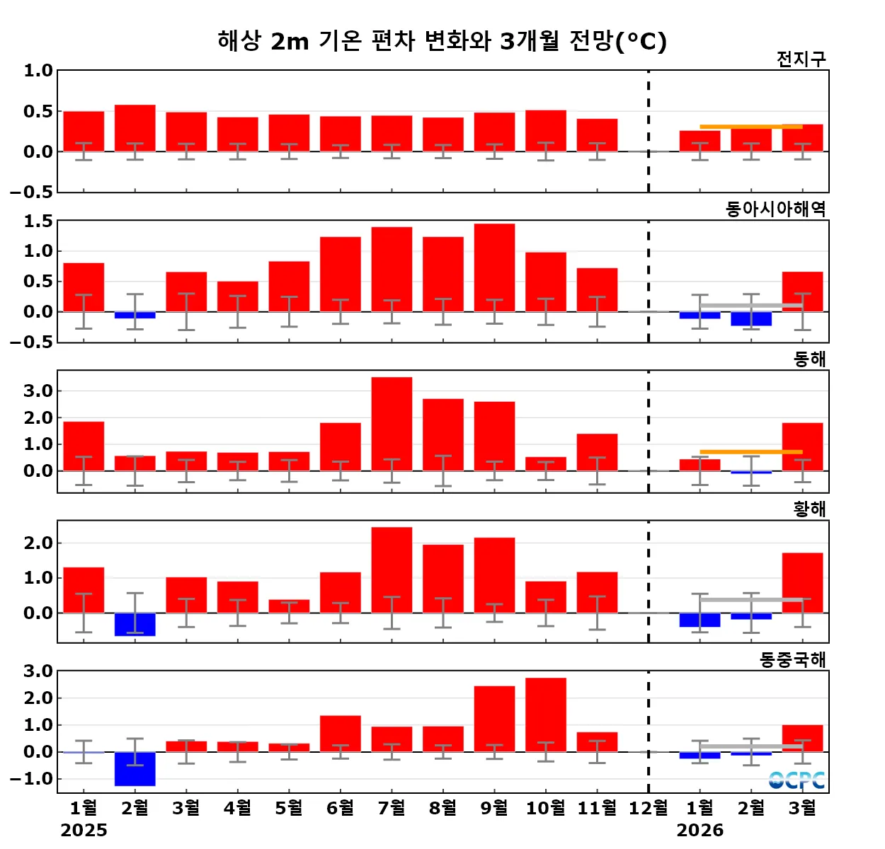구간표시선: 평년평균±0.5 표준편차, 가로실선: 3개월 평균 편차 전망 (주황색: 높음, 회색: 비슷함, 하늘색: 낮음)