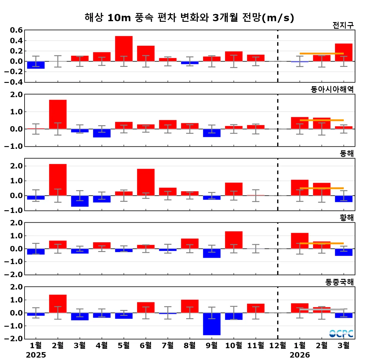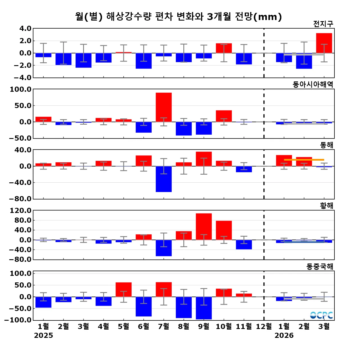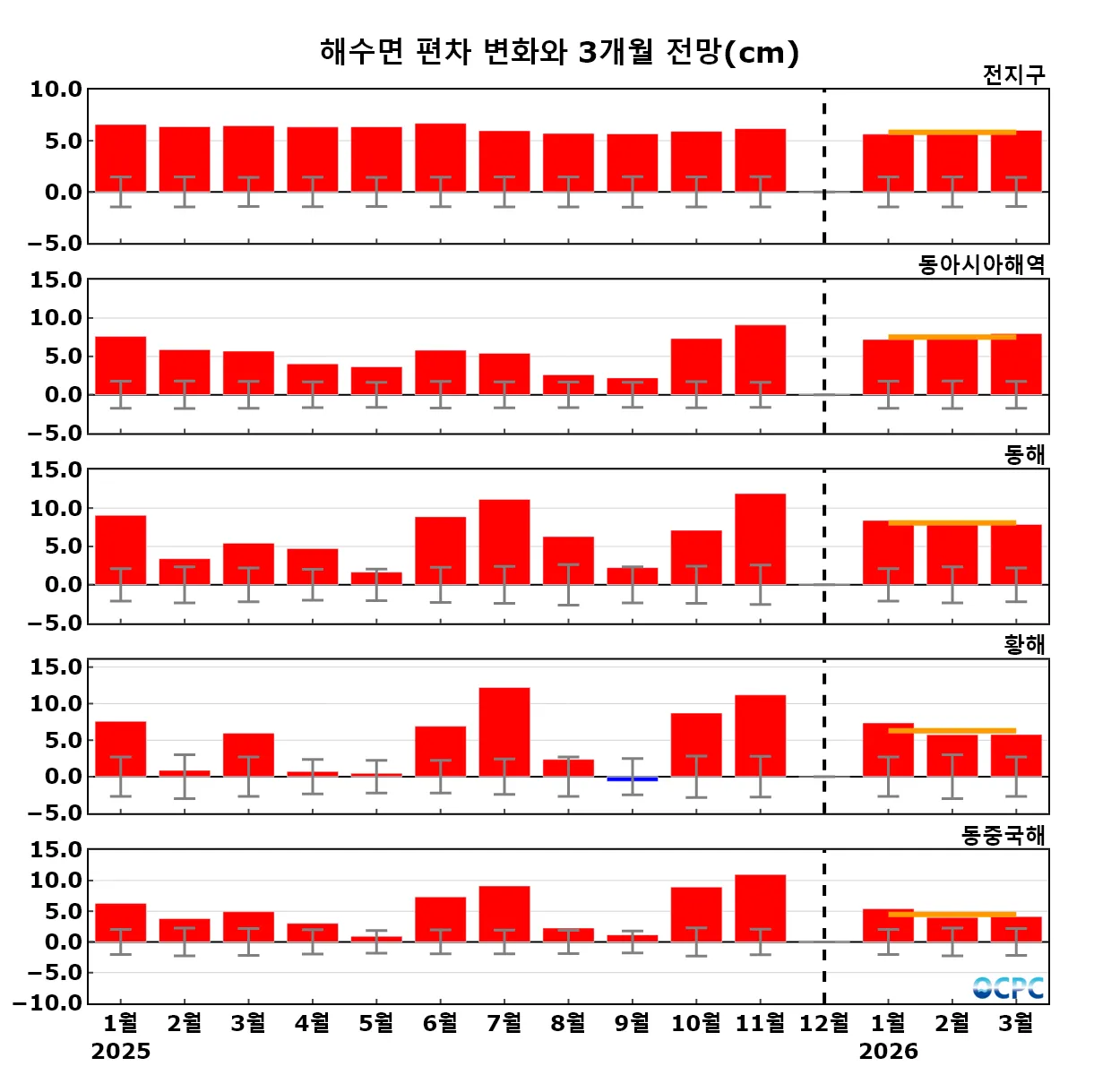 구간표시선: 평년평균±0.5 표준편차, 가로실선: 3개월 평균 편차 전망 (주황색: 높음, 회색: 비슷함, 하늘색: 낮음)