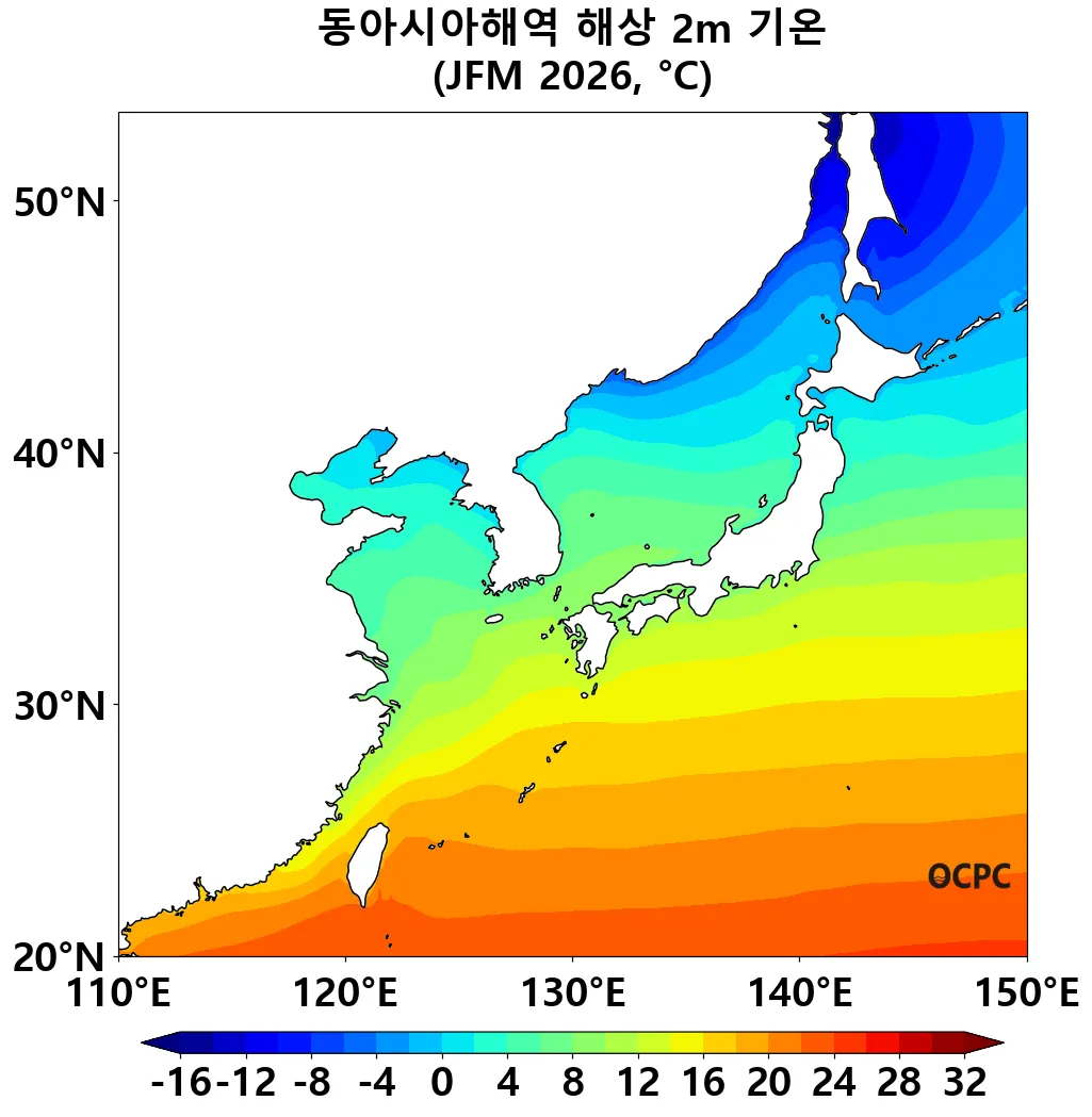 동아시아해역 2026년 1~3월 평균 해면수온은 평년(16.3±0.2℃)보다 0.5℃ 높겠습니다.