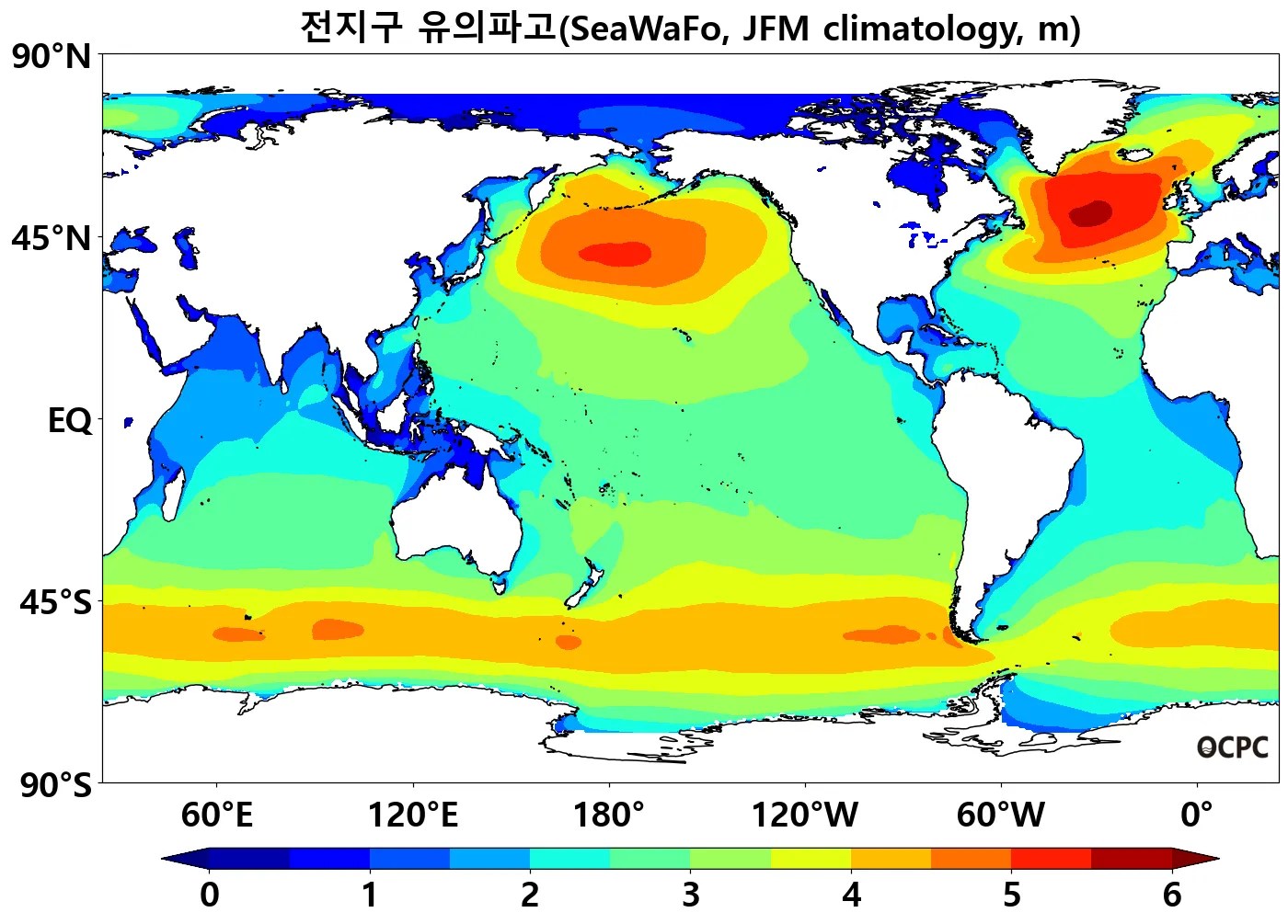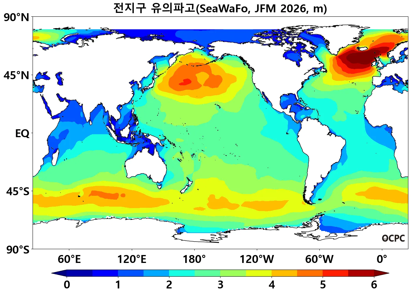전지구 2026년 1~3월 평균 유의파고는 평년(2.92±0.04m)보다 낮을 것으로 전망됩니다.