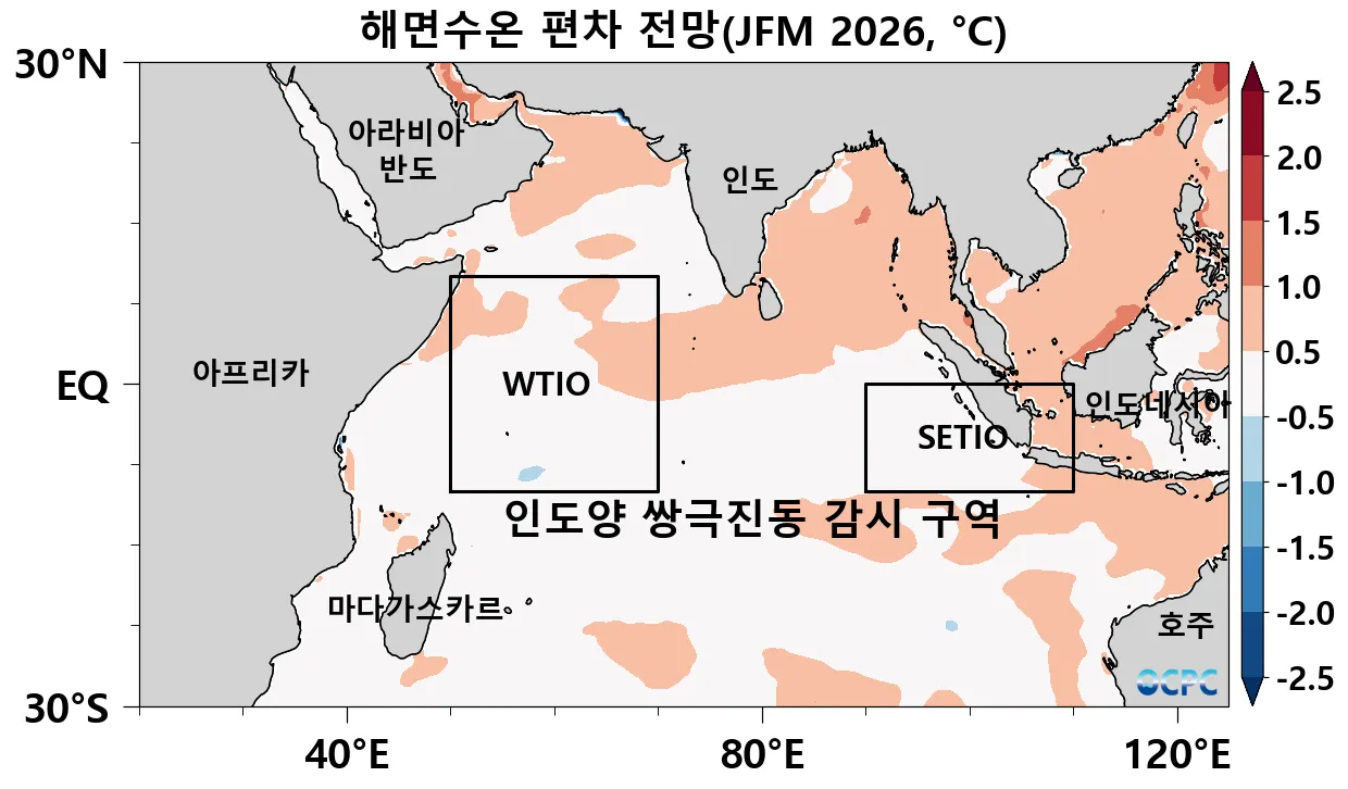 2025년 12월 1~20일까지의 평균 열대 서인도양 해역(WTIO)과 남동인도양 해역(SETIO) 두 해역 간 편차의 차이는 -0.3℃로 중립 상태이며, 향후 3개월 열대 서인도양과 남동인도양 해면수온 편차 차이는 0℃에 가까워 2026년 1~3월 (JFM) 인도양 쌍극진동 지수는 중립 상태로 전망합니다.