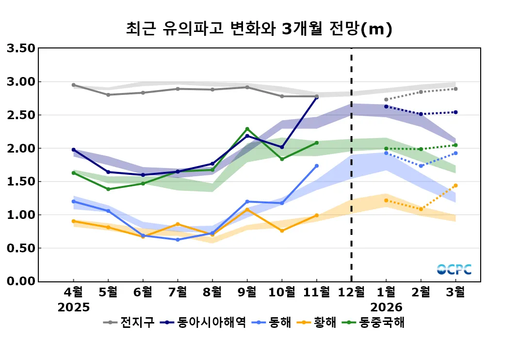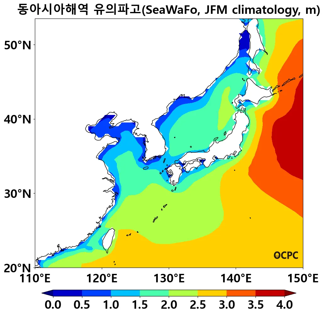 동아시아해역의 2026년 1~3월 평균 유의파고는 평년(2.36±0.08m)보다 높을 것으로 전망됩니다. 동해, 황해, 동중국해를 포함한 동아시아해역에서 1월부터 3월로 갈수록 해상풍속이 평년 대비 점차 강해질 것으로 예상되며, 이에 따라 유의파고 역시 전반적으로 높을 것으로 전망됩니다.