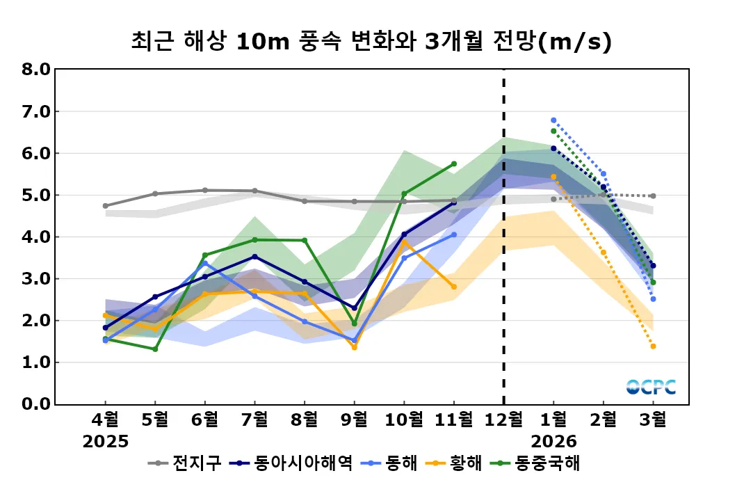 동해, 황해의 2026년 1월~3월 평균 해상풍속은 평년(4.4±0.4m/s, 3.1±0.4m/s)보다 강하겠고, 동중국해의 2026년 1월~3월 평균 해상풍속은 평년(4.6±0.3m/s)과 비슷하겠습니다.