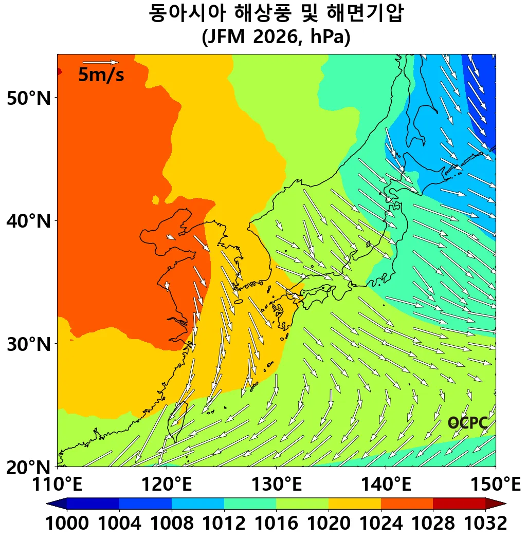 동아시아해역의 2026년 1월~3월 평균 해상풍속은 평년(4.4±0.3m/s)보다 강하겠습니다.