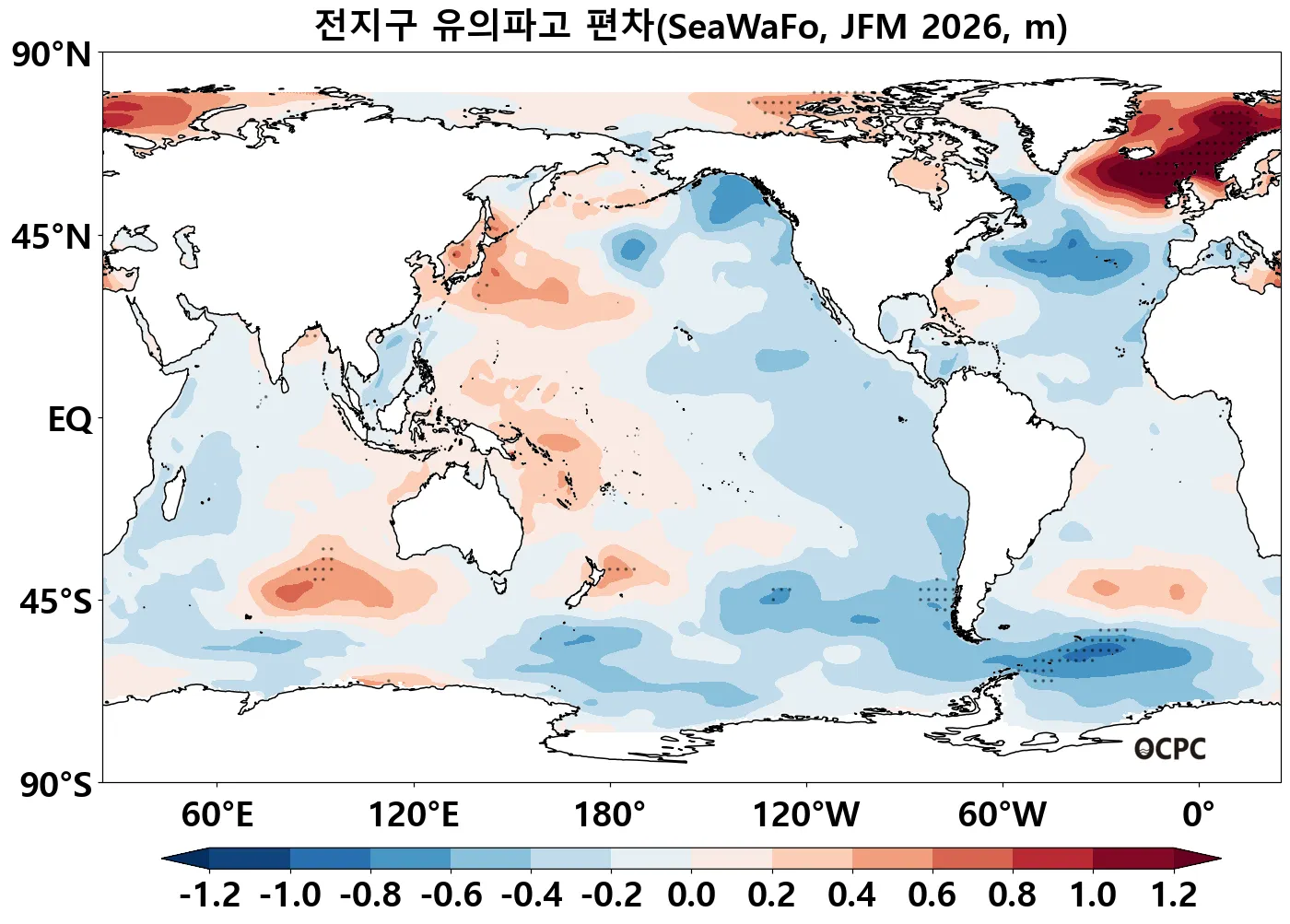 A-B. 전지구 유의파고 편차 전망(2026년 1월~3월 평균, 점표시: 평년 ±2 표준편차 초과해역)