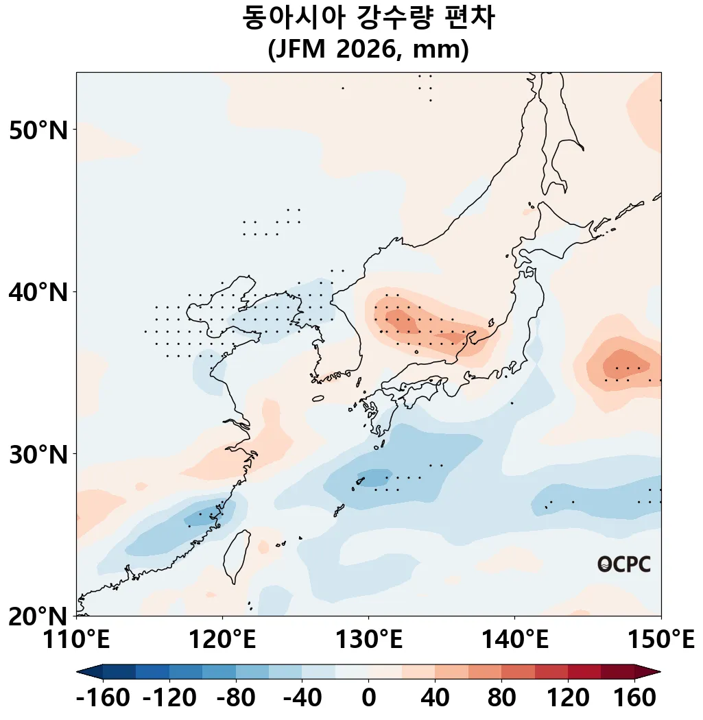 B. 동아시아 강수량 편차 전망(2026년 1월~3월 평균점표시: 평년 ±2 표준편차 초과해역)