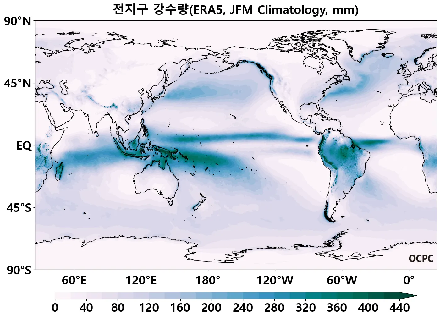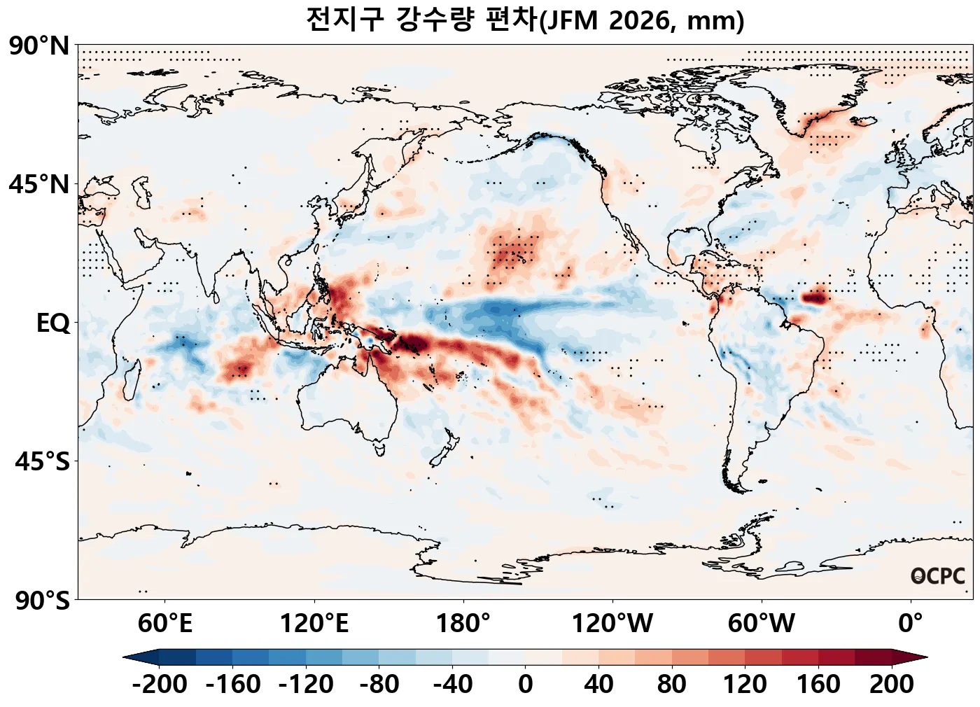 2026년 1월~3월 열대 서태평양의 평균 해상 강수량은 양의 편차를, 열대 중태평양 평균 해상 강수량은 음의 편차를 보이겠습니다. 또한 인도양 서쪽에서 해상 강수량의 음의 편차가, 동쪽에서 양의 편차가 나타나는 쌍극 구조가 나타나겠습니다. 이러한 해상 강수량 편차의 공간 분포는 라니냐 시기에 나타나는 공간 분포와 유사합니다(엘니뇨 백서 (2016)).